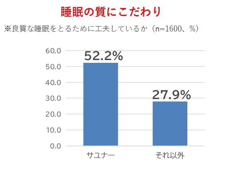 サユナー(温活で白湯を飲んでいる人)とそれ以外の人との比較で健康に関する取り組みについて聞いたところ、サユナーは美容液などで肌の保湿ケアを毎日行うなど美容意識が高く、普段からトレーニングで体を鍛えている、そして良質な睡眠をとるために工夫している人が多い傾向が浮き彫りとなりました。こうした層から飲用層が一般化し、拡大しているものと推察します。