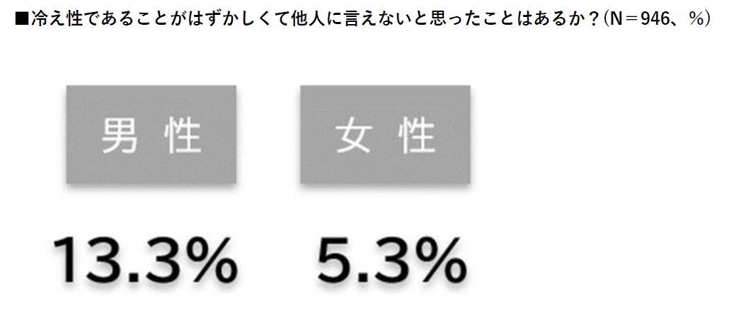 何歳ごろから冷え性になったか、という質問においては、早い人は幼少期、多くは10から20代に冷え性になる人が多いことが明らかになりました。全体的に年齢を重ねてから感じる人が多い傾向がありますが、20代に限っては6割が10代で冷え性になったと回答しており顕著に高い結果※となりました。また、男性の冷え性の人のうち13.3%が「冷え性であることをはずかしくて他人に言えない」と感じており、男性の冷え性はオープンに言えない雰囲気もあるようです。