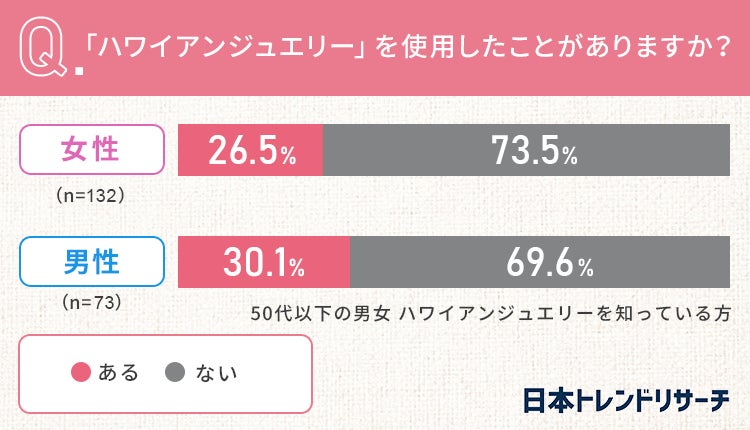 女性の26.5%、男性の30.1%が「ハワイアンジュエリーを使用したことがある」と答えました。