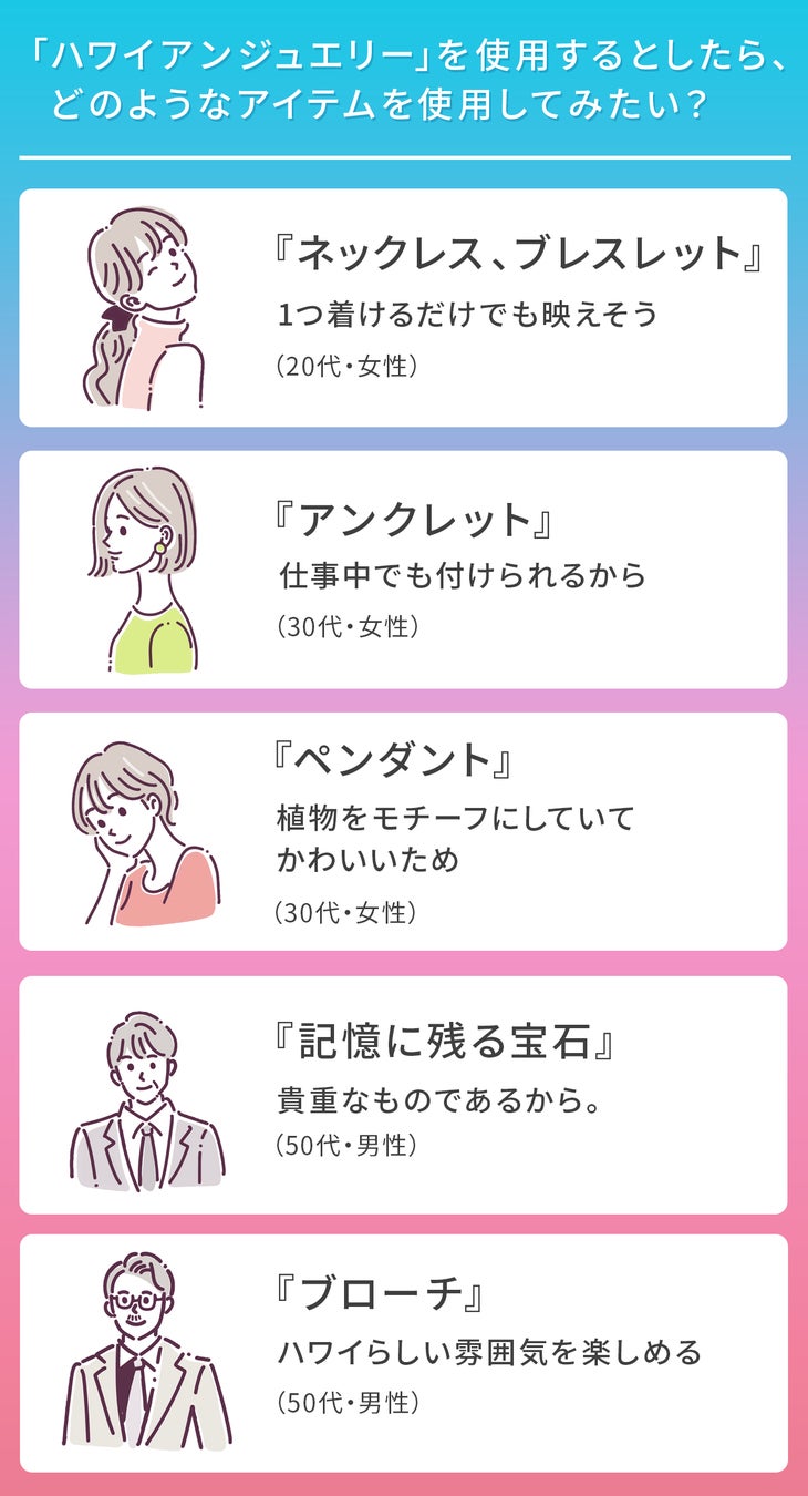 「ハワイアンジュエリー」を使用するとしたら、どのようなアイテムを使用してみたいか、その理由もあわせて聞いてみたので、紹介します。