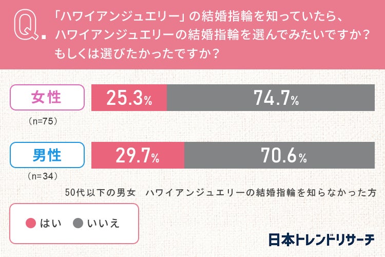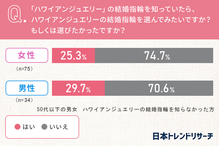 女性の25.3%、男性の29.4%が、「ハワイアンジュエリー」の結婚指輪を知っていたら、ハワイアンジュエリーの結婚指輪を選んでみたい・選びたかったと答えました。
