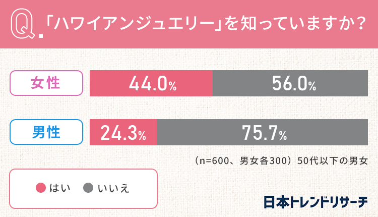 女性の44%、男性の24.3%が「ハワイアンジュエリーを知っている」と答えました。