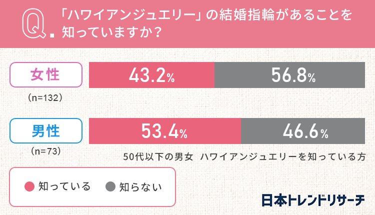 女性の43.2%、男性の53.4%が「ハワイアンジュエリー」の結婚指輪があることを知っていると回答しました。