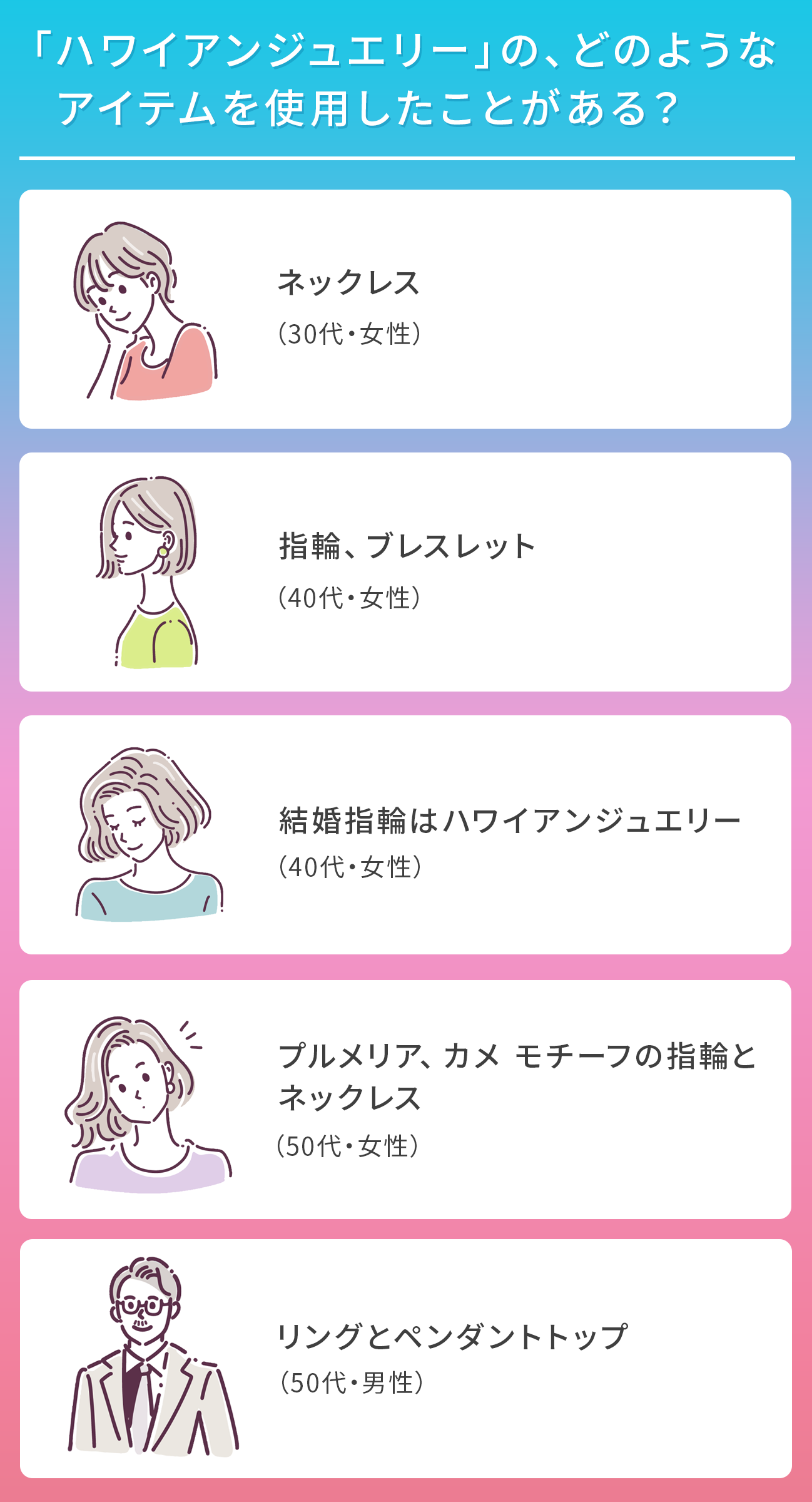 「ハワイアンジュエリー」の、どのようなアイテムを使用したことがあるか聞いてみたので紹介します。