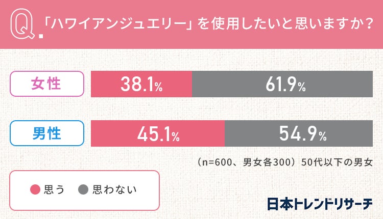 女性の38.1%、男性の45.1%が「ハワイアンジュエリー」を使用したいと思うと答えました。