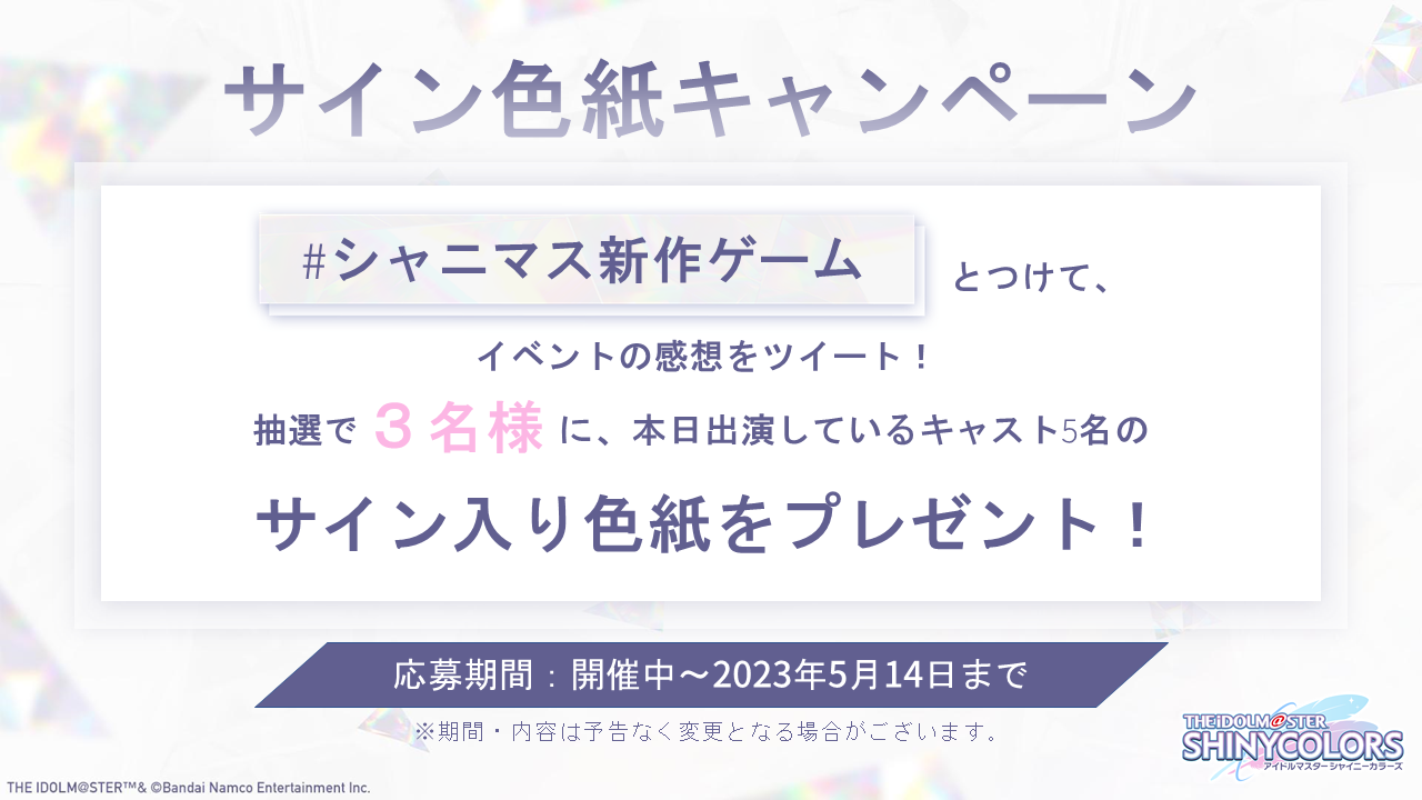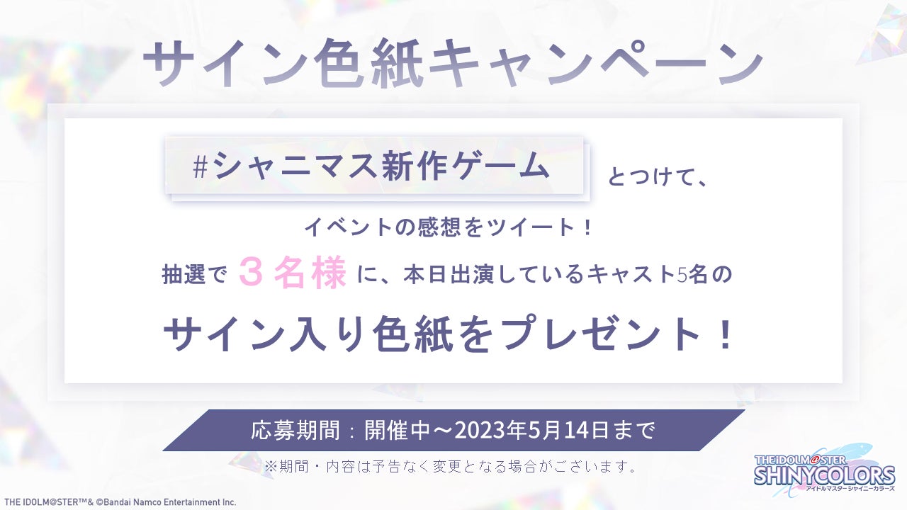「アイドルマスター シャイニーカラーズ 新作ゲーム制作発表会」の開催を記念して、出演キャストのサイン色紙が抽選で3名様に当たる、Twitterキャンペーンを開催いたします!