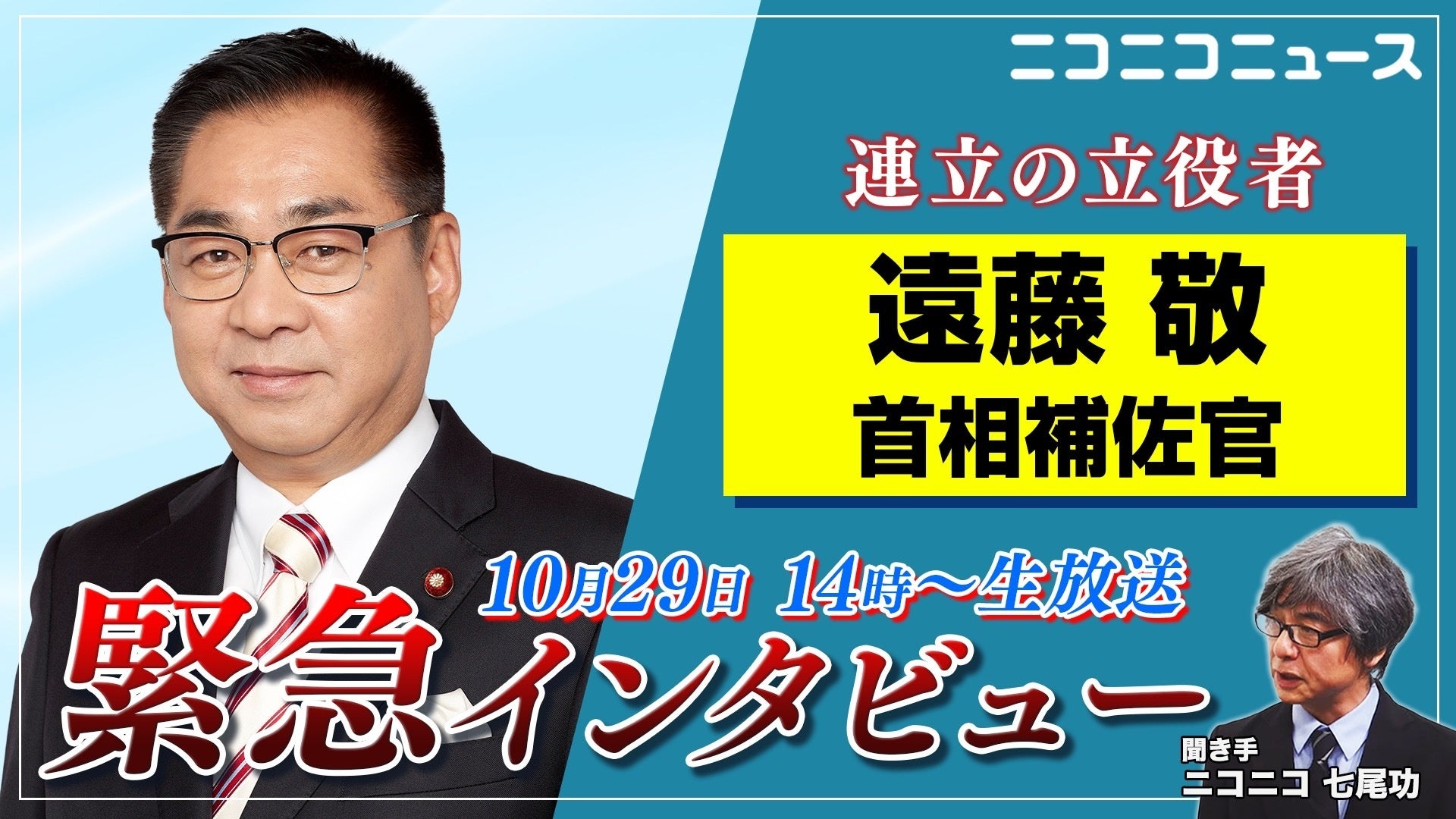自民・維新 連立合意のキーマン 遠藤敬 内閣総理大臣補佐官が就任後初のネットメディアに生出演 10月29日(水)14時~ニコニコで独占ロングインタビュー実施