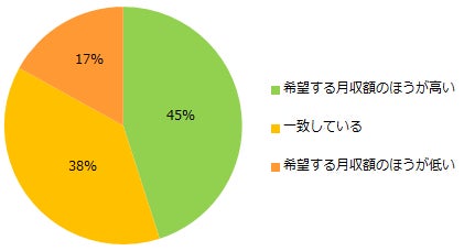 2:希望する月収額/現在の月収額の比較。「希望する月収額のほうが高い」が45%。(図2)