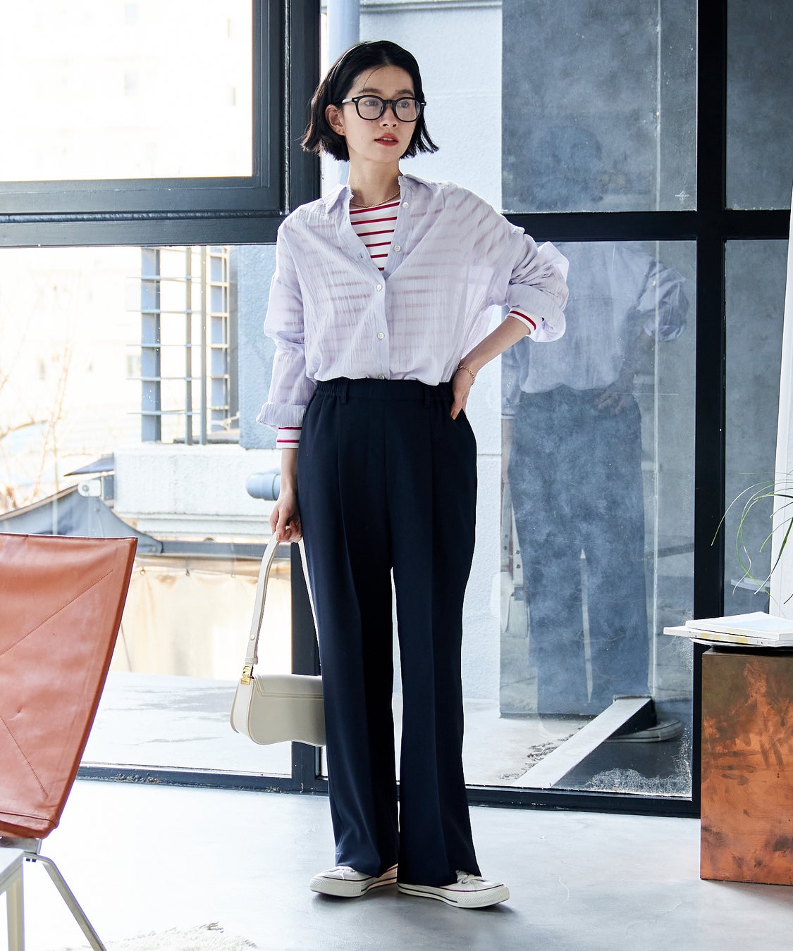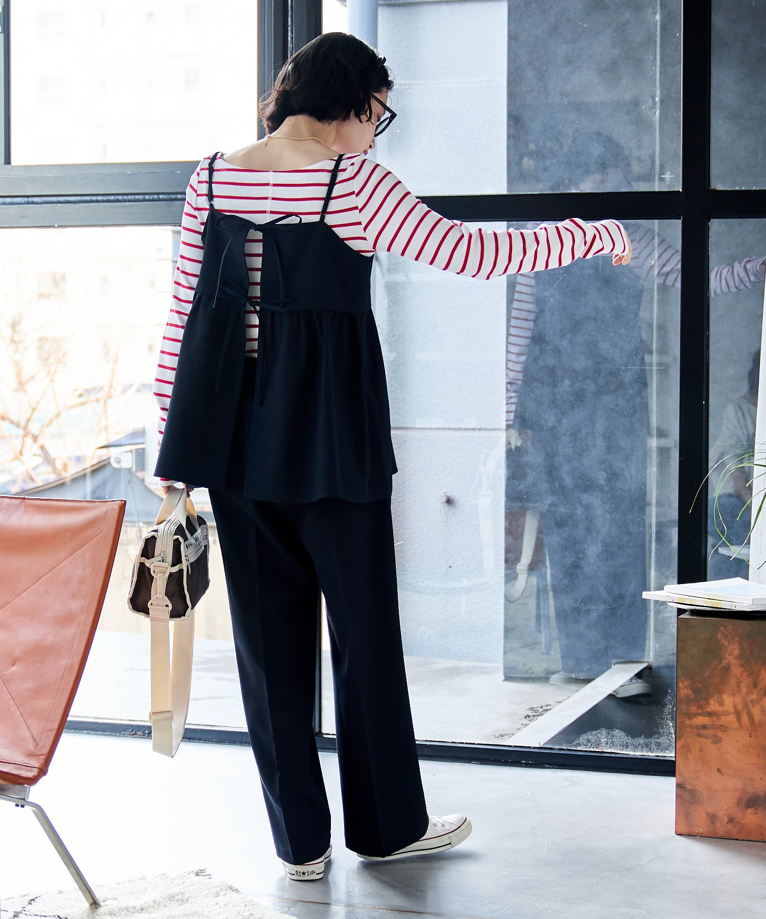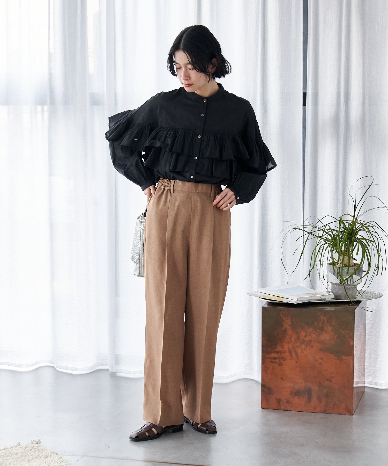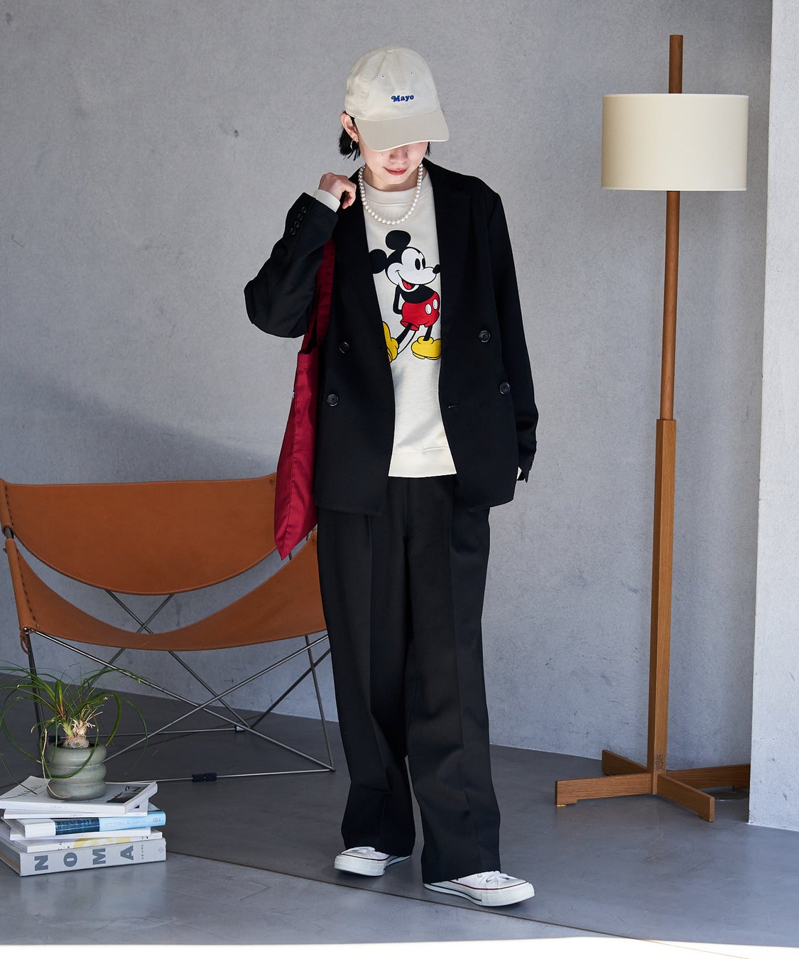 バックリボンやフレアシルエットの華やかなデザインは、お祝いごとのハレの日にぴったり。 黒のスタンド襟ブラウスを合わせてベージュのセットアップをシックな印象に昇華。 ホワイト小物で明度をプラスし、軽やかな入園式コーデに。