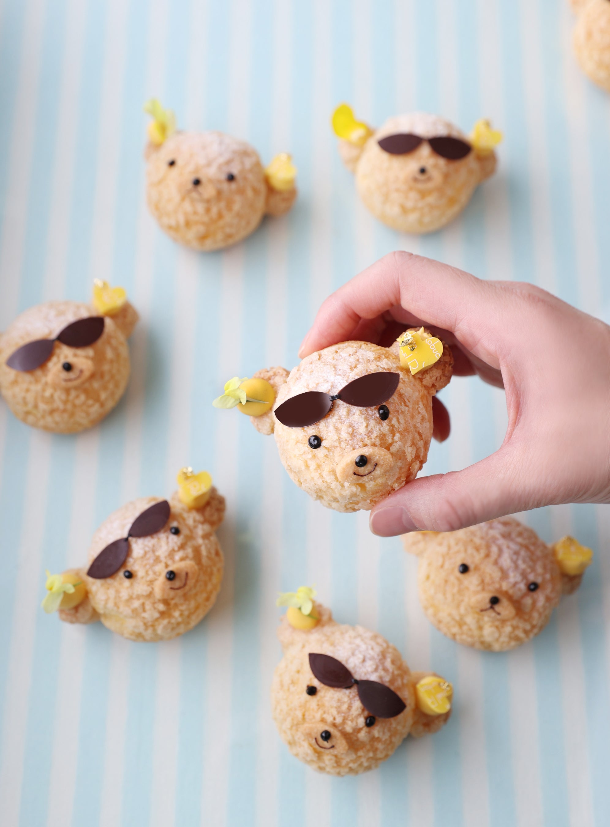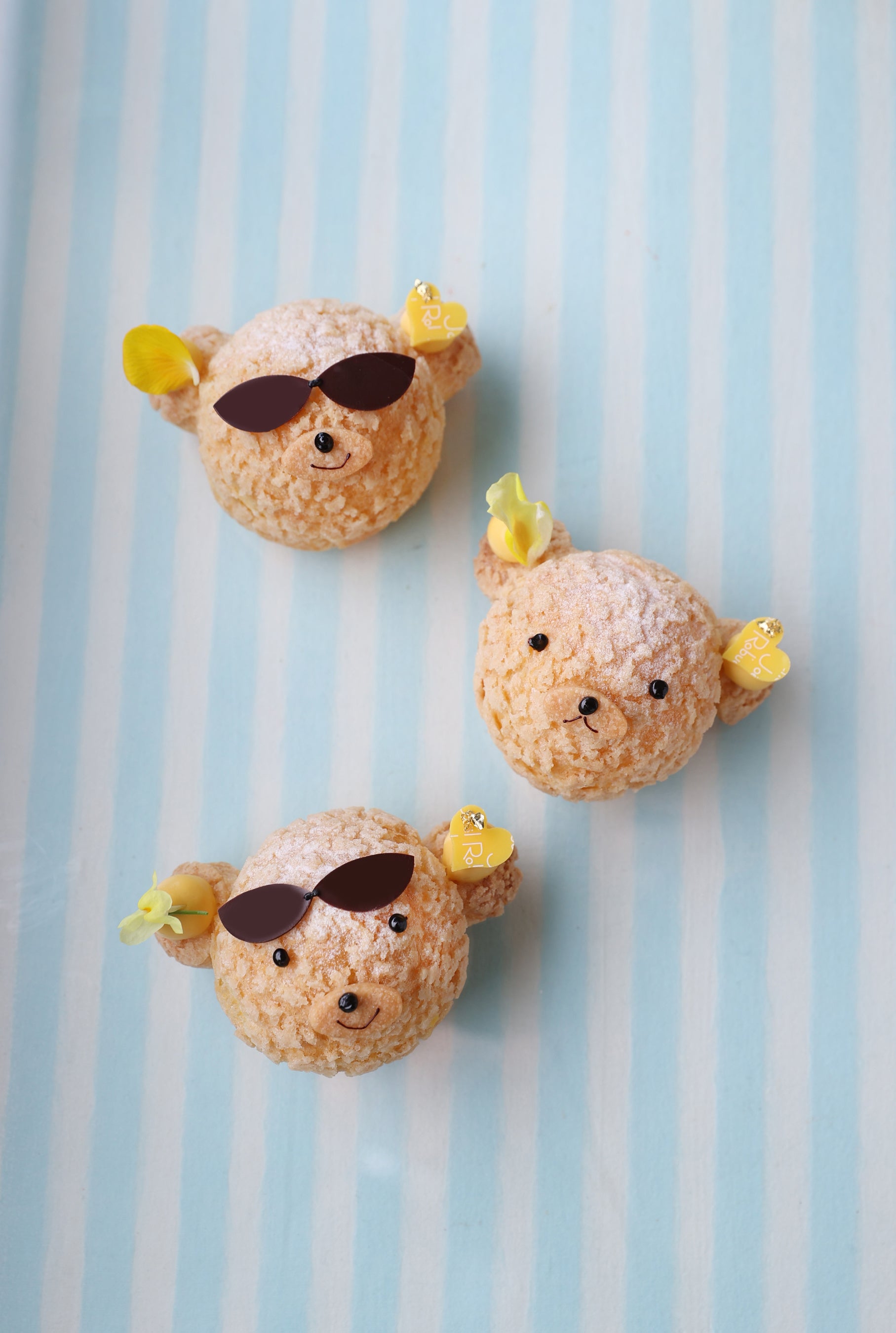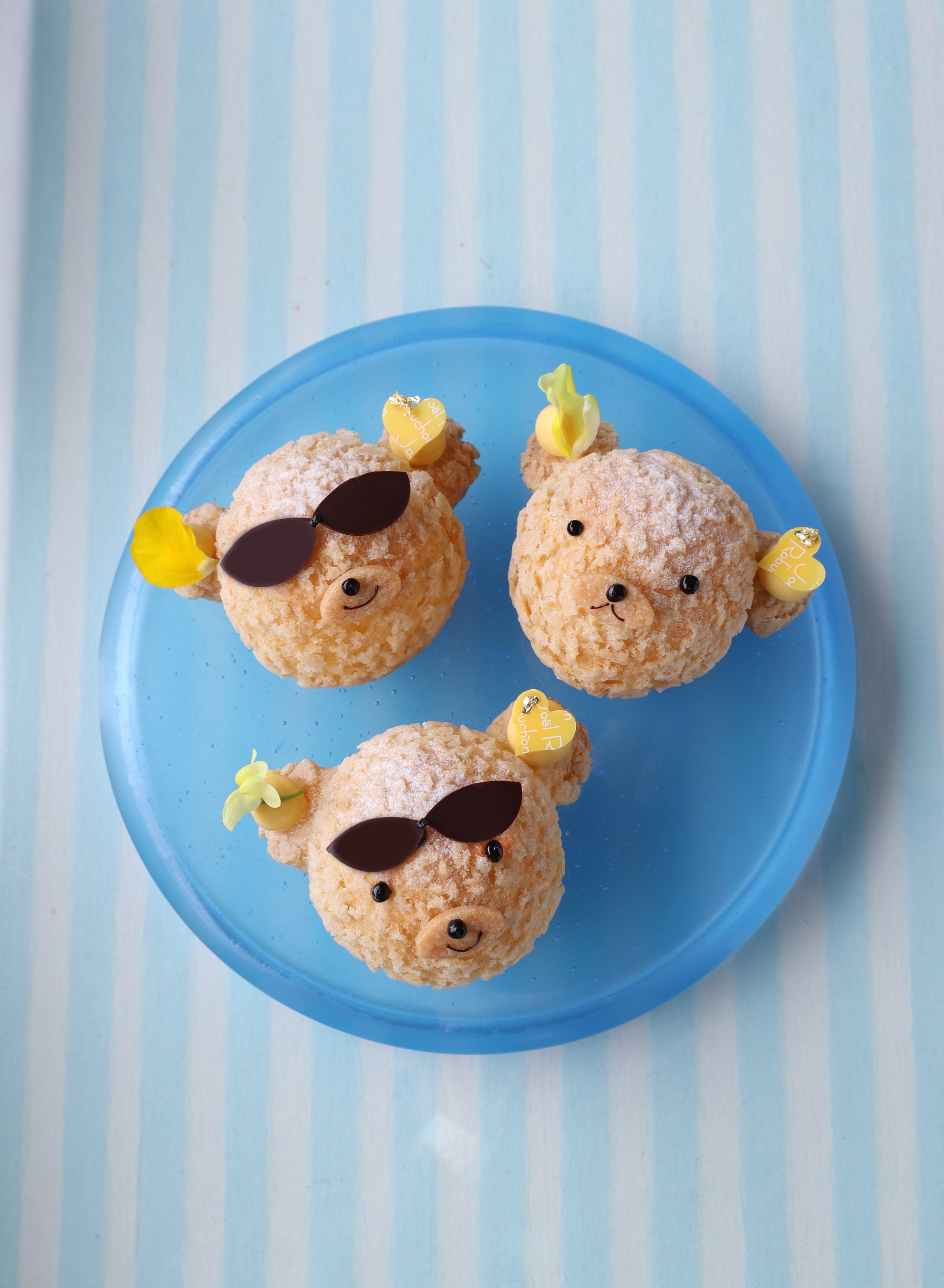 夏らしくサングラスをかけるなど遊び心いっぱいのクッキー生地をのせて焼き上げた可愛らしい「クマさんシュー」。ふわっと軽いシュー生地の中に、マンゴーとパッションフルーツの爽やかなクリームをたっぷり詰めた夏季限定スイーツです。表情が異なる3 種を販売いたします。