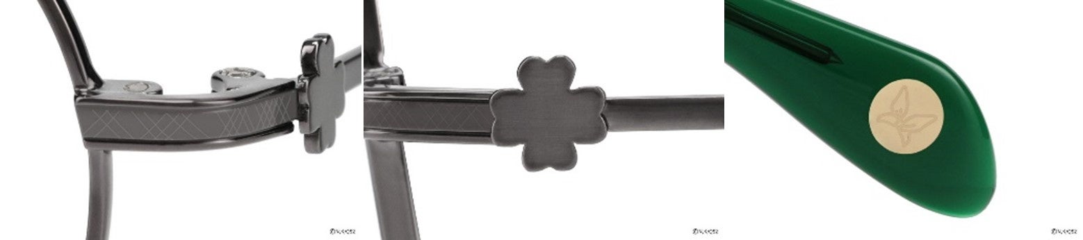 やわらかい印象を与える細身のラウンドシェイプは、ユニセックスでかけやすく、お人好しな四葉らしさを表現。つる先にはトレードマークのリボンモチーフを、フロントサイドにはボウタイのチェック柄をデザイン。