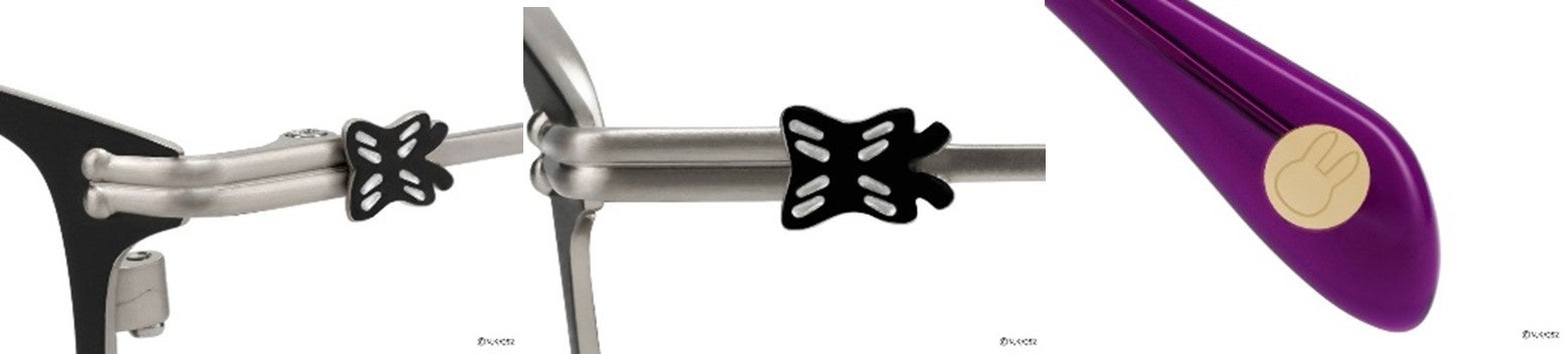 つる先には二乃の好きな動物を、フロントサイドにはトレードマークである蝶のリボンモチーフをデザイン。光沢を抑えマットに仕上げることで肌なじみの良さにもこだわった、薄くて軽いメタルフレーム。