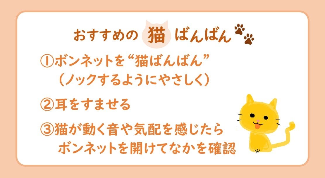 乗車の前はボンネットなどエンジンルーム付近をやさしくたたき、乗車後はエンジンをかける前に数秒静止し猫の気配がしないか確認するなど、できることを実践しましょう。
