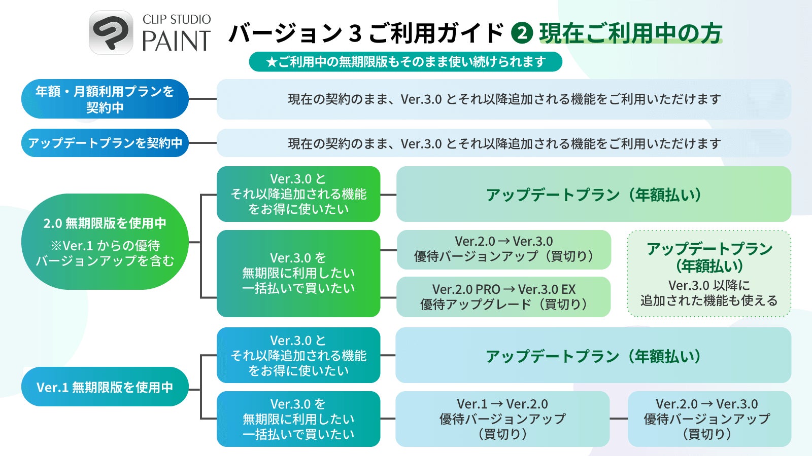 CLIP STUDIO PAINTの現在のご利用状況に応じて、Ver.3.0をご利用いただける方法は異なります。