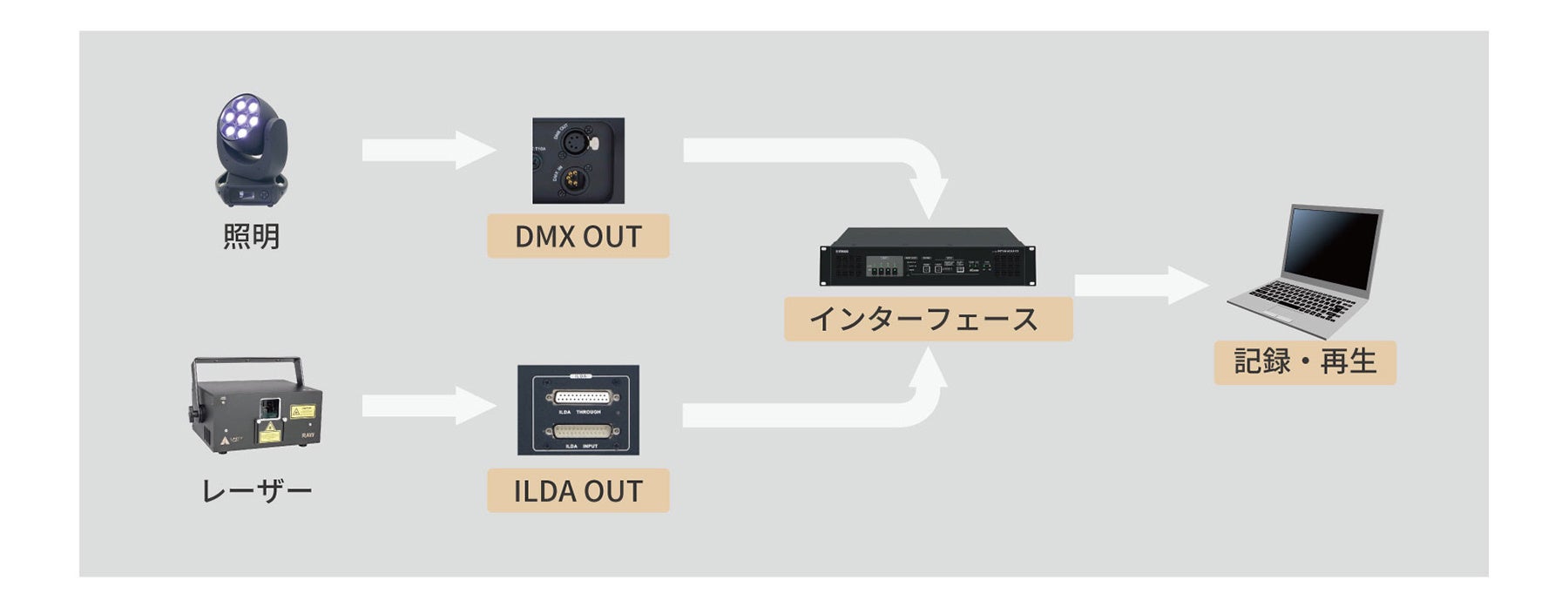 PAミキサーや照明コントローラーなどの機材を『GPAP』専用のインターフェースにケーブル接続するだけで、各フォーマットをwav形式に変換し、オーディオデータとして収録できます。また、マルチトラックレコーダーやPCなど、wavファイルの再生機能を備えたさまざまなデバイスを『GPAP』の再生装置として利用することができます。さらに、記録したデータは「Cubase」などの市販DAWソフトで編集可能で、ソフト上で音声と照明やレーザーなどのデータを並列で編集することも可能です。