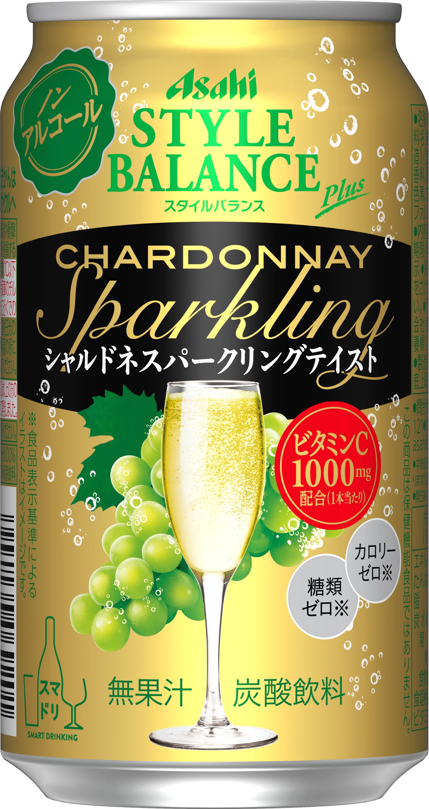 『アサヒスタイルバランスプラス シャルドネスパークリングテイスト』は1缶あたり1000㎎のビタミンCを配合したサワーテイスト清涼飲料です。「スタイルバランスプラス」の特長である“アルコール0.00%”“カロリーゼロ※2”“糖類ゼロ※2”にくわえ、ぶどうの程よい酸味と豊かな果実味をお楽しみいただけます。パッケージは小さな気泡を描いたシャンパンゴールドを背景に、みずみずしいぶどうと脚付きのグラスを描くことで、商品の特長を分かりやすく訴求するとともに贅沢なイメージを演出しています。