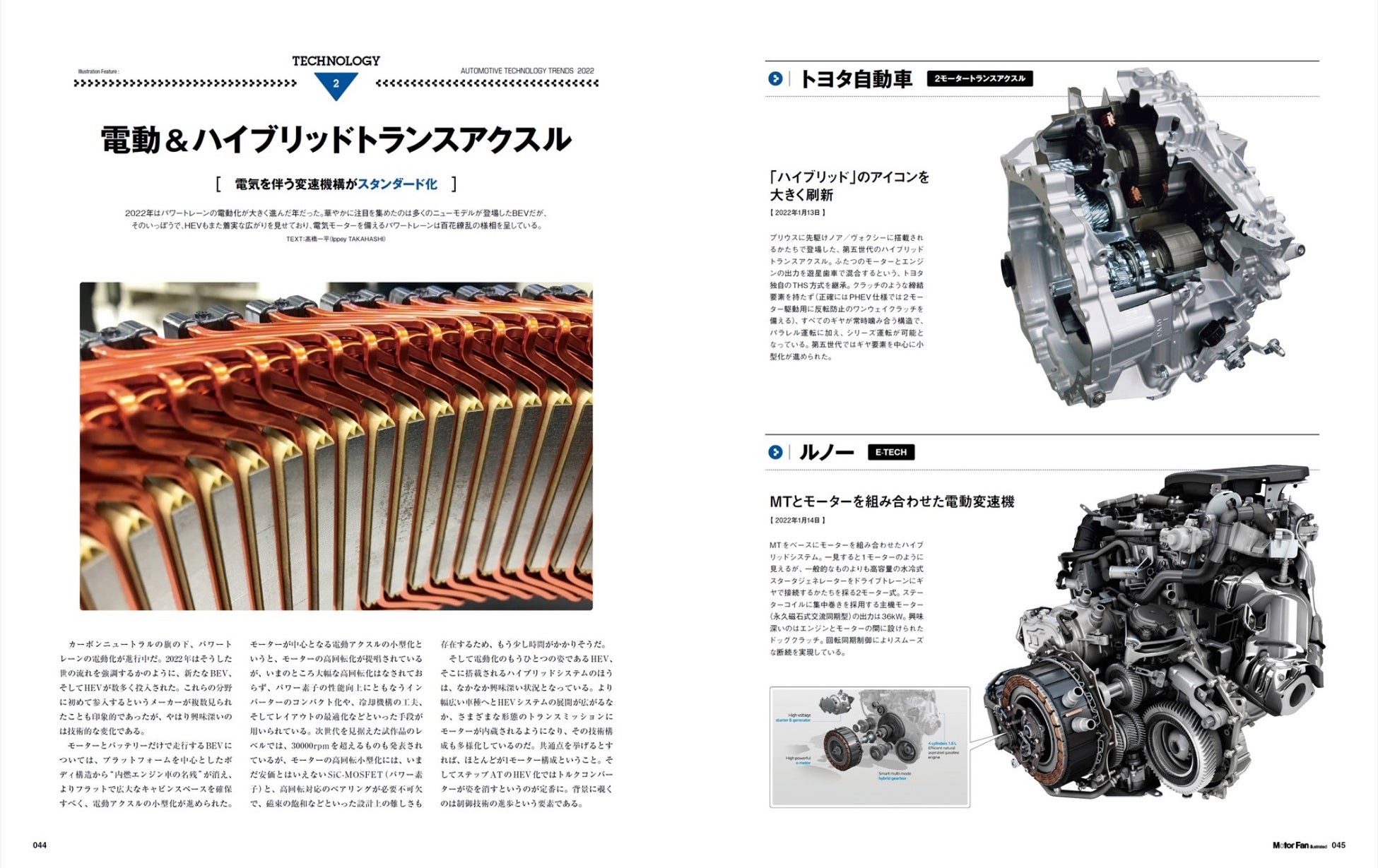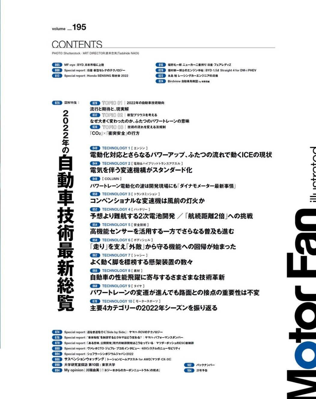 いろいろな分野を含みどんどん高効率化と高機能化を目指す自動車というプロダクト。モーターファン・イラストレーテッドはひとつのテーマに沿った特集主義で毎号企画を組んでいますが、195号は「今年の自動車技術トピック集」としての包括的な内容としました。2022年には自動車をめぐる技術にどのような出来事があったのかを、各種のトピックから紹介します。目指したのは「令和4年度自動車技術白書」です。