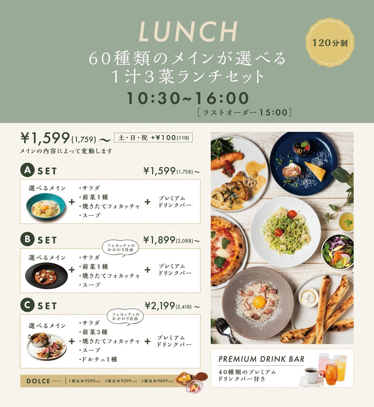 Aセットでカジュアルに楽しんだり、焼き立てフォカッチャおかわり自由が付いたBセット・Cセットでゆったりと優雅なランチを楽しむなど、様々なシーンでお使いいただけます