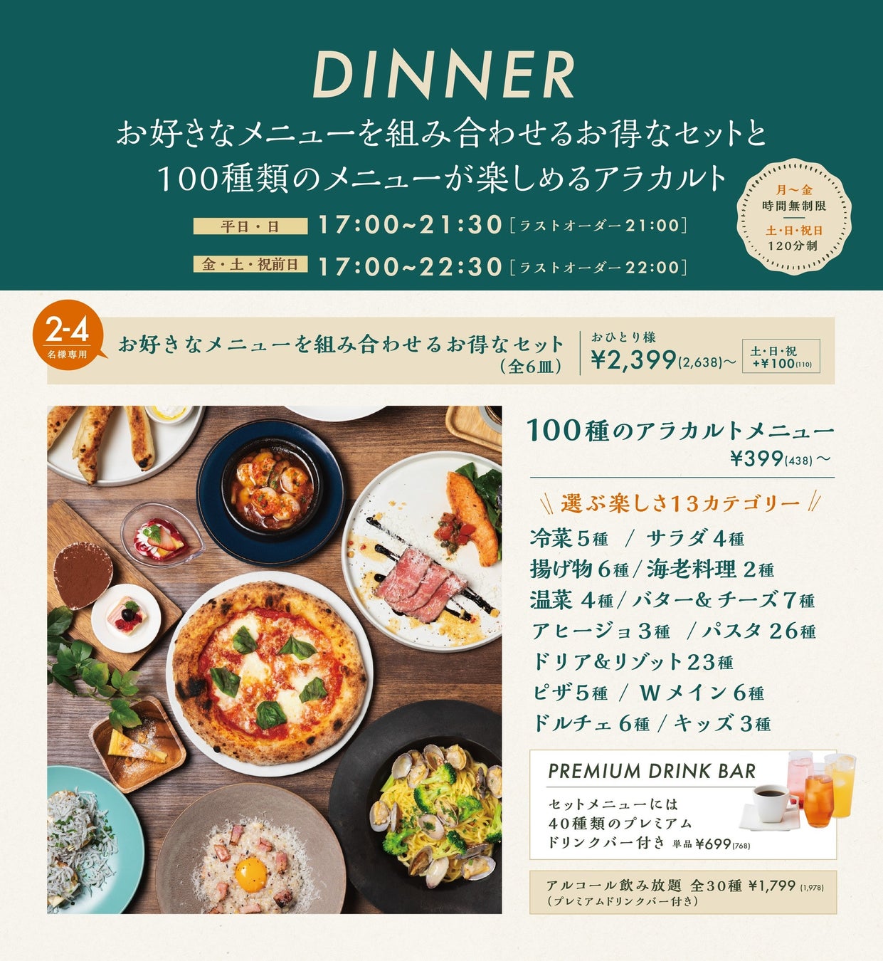 ディナーは100種類のメニューが楽しめるアラカルト or お好きなメニューを自由に組み合わせるセットメニューでお選びいただけます