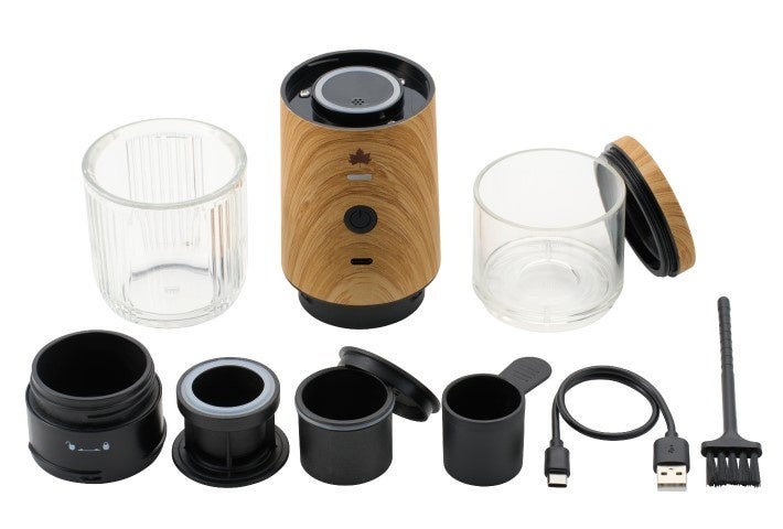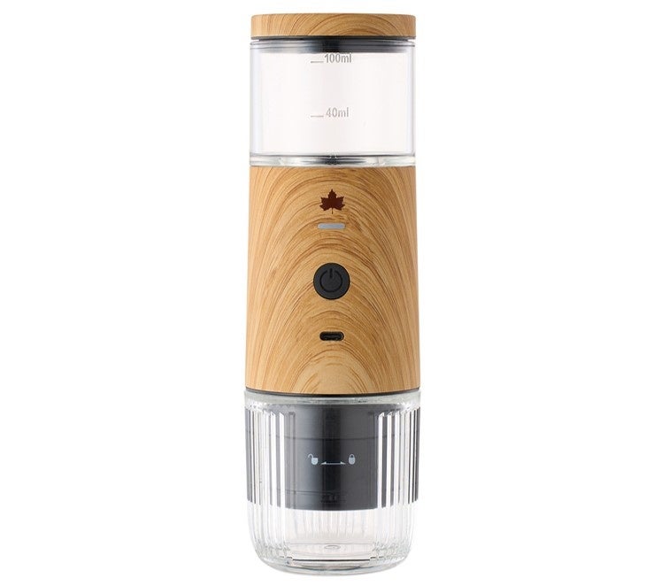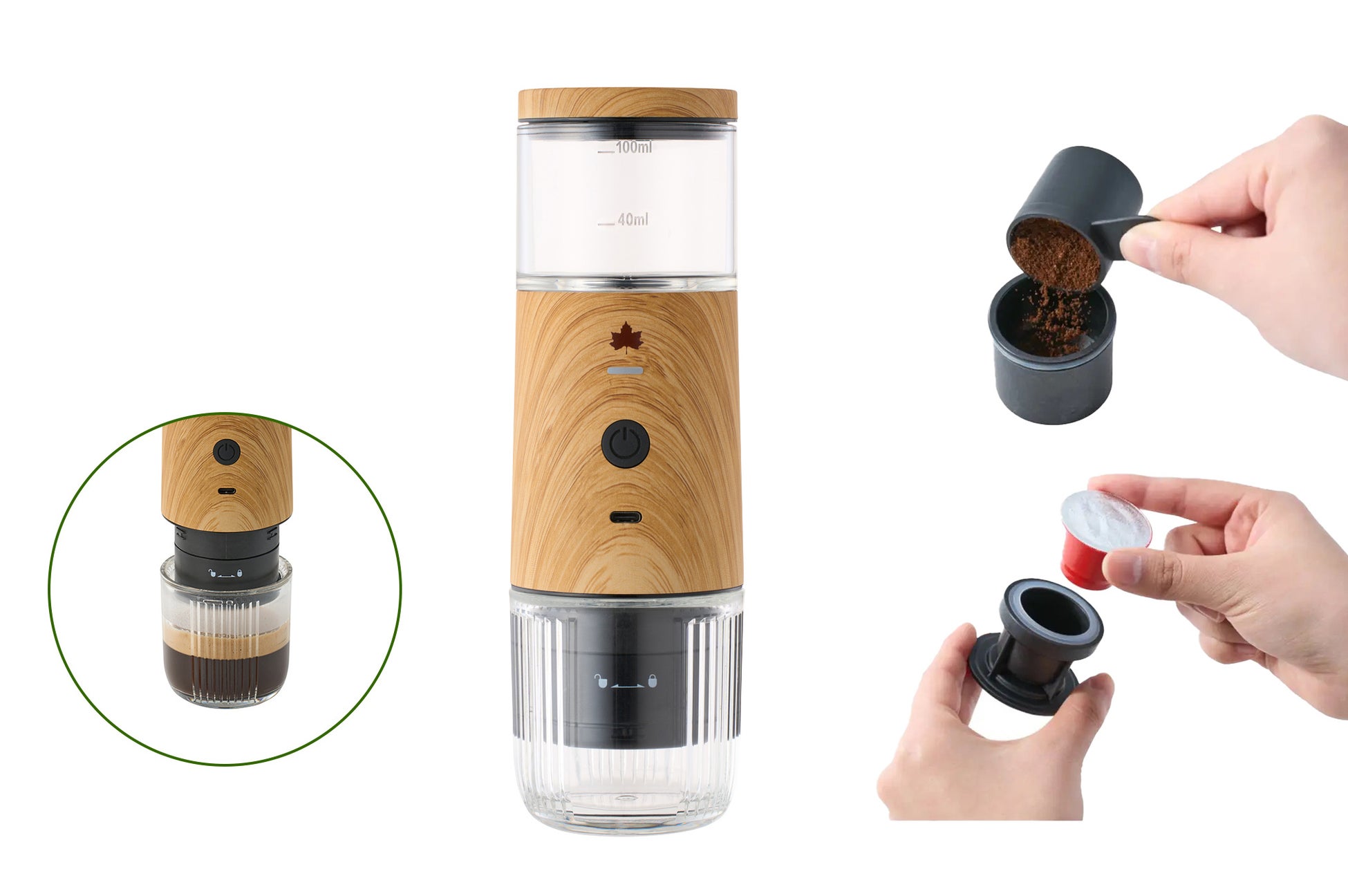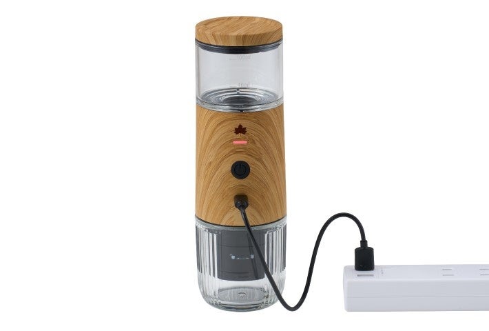 アウトドアシーンで、気軽にエスプレッソを楽しむことができる、コードレスで全自動タイプのエスプレッソメーカー。ナチュラルで温かみのある木目調のデザインで、お家のインテリアやキャンプサイトにも馴染む。