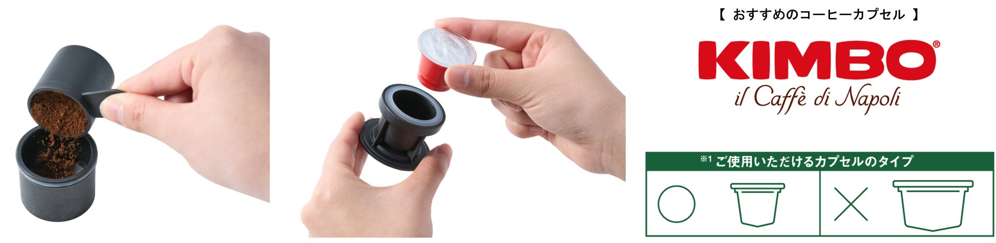 挽いた粉とコーヒーカプセル両方に対応した2WAYタイプで、手軽に使える市販のコーヒーカプセルや、お好みのエスプレッソ粉(極細挽き)でも抽出できる。粉を入れるのに便利な計量カップも付属。