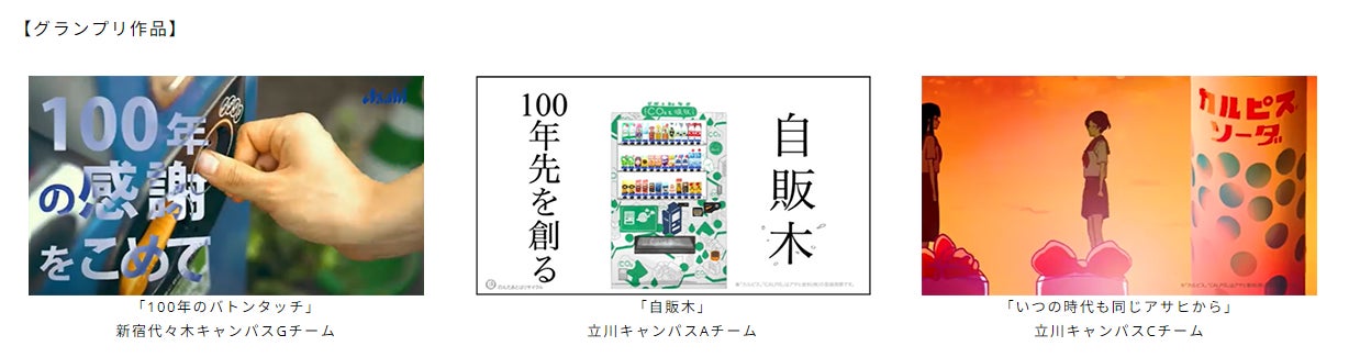 全20チームが約半年にわたってWeb CM制作に取り組み、学内選考およびアサヒ飲料役員へのプレゼンテーションを経た最終審査の結果、「100年のバトンタッチ」「自販木」「いつの時代も同じアサヒから」が同点で一位となり3作品がグランプリに選ばれました。最終選考では「アサヒ飲料っていいな・応援したいな」と視聴者に感じてもらえるかという点を評価ポイントとしてグランプリ作品を選定しました。