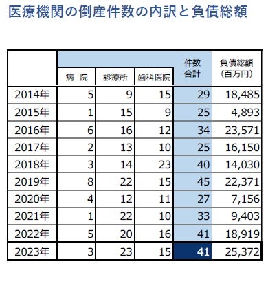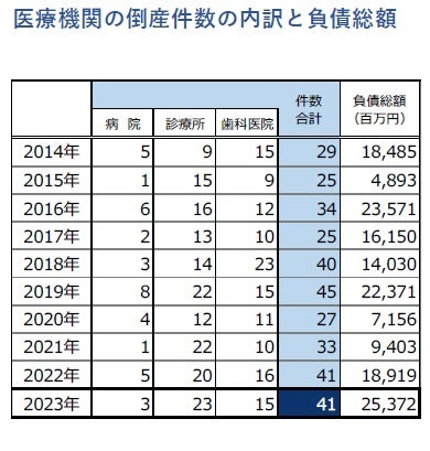 業態別にみると、「病院」が3件(負債147億1900万円)、「診療所」が23件(同55億9700万円)、「歯科医院」が15件(同50億5600万円)となり、「診療所」は2009年(27件)、「歯科医院」は2018年(23件)、2022年(16件)に次いで多かった。