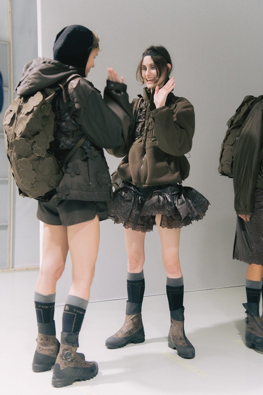 THE NORTH FACEとのコラボレーションに着想を得たグリーンやカーキなどのミリタリーカラーを、ブランドのシグネチャーでもあるフラワーディテールや繊細なテクスチャーと融合。アノラックパーカーやランニングベストなど、スポーティな要素を優美に昇華させた新しいスタイルが登場します。