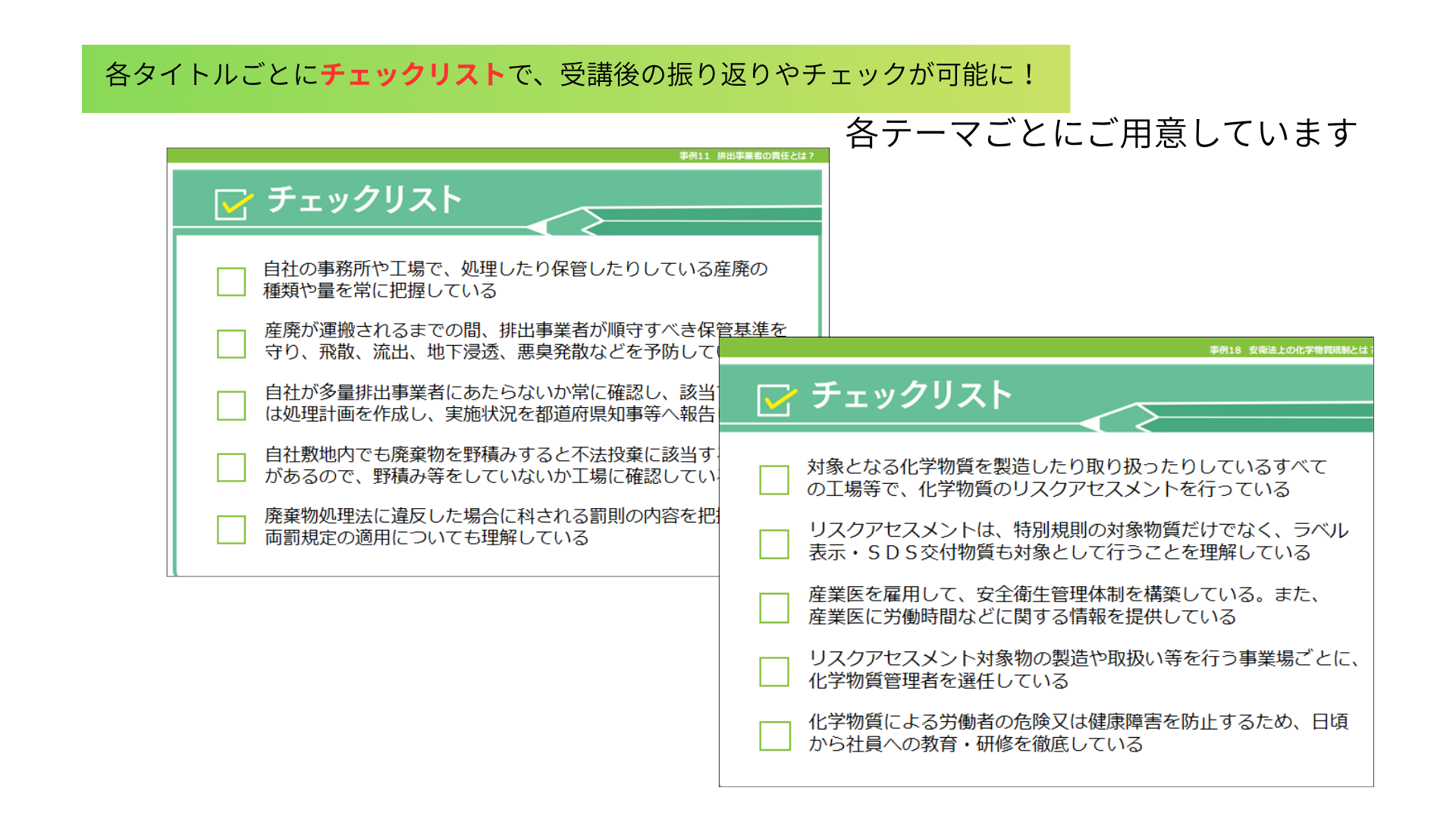 ◆テーマごとにポイントをまとめたチェックリストで、受講後の振り返りやチェックが可能!