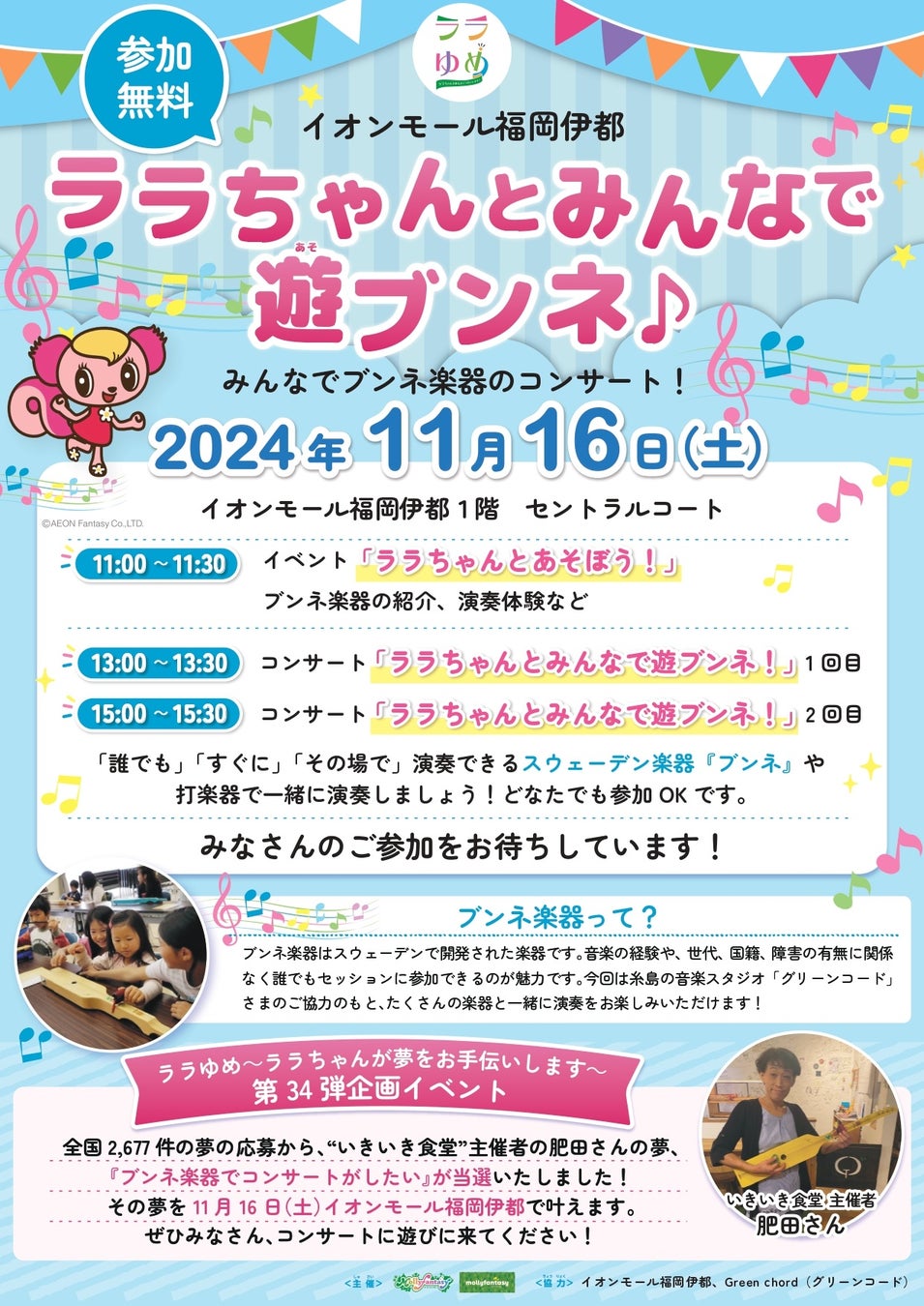 今回、糸島の音楽スタジオ グリーンコードさまとイオンモール福岡伊都にご協力いただき、イベント観覧者の皆さんと一緒に楽しむ、『ララちゃんといっしょに遊ブンネ♪』と題したブンネ楽器のコンサートを開催します。