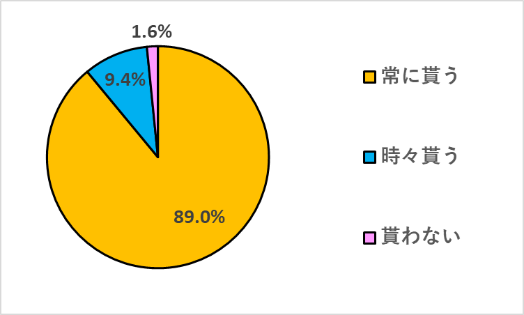 レシートを貰うかどうかについては、「常に貰う」が89.0%、「時々貰う」が9.4%という結果になり、9割近くの方が常に貰っていることが分かりました。