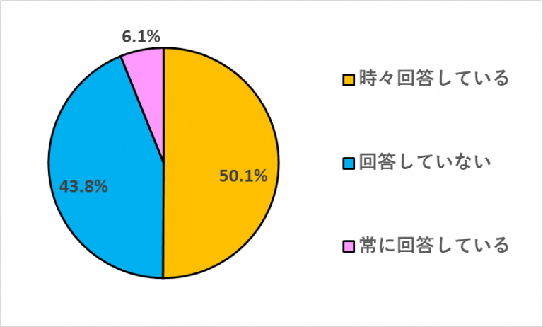 「レシートにQRコードなどのアンケートがついていたら回答していますか?」の質問に対し、「時々回答している」が50.1%、「常に回答している」が6.1%という結果になりました。