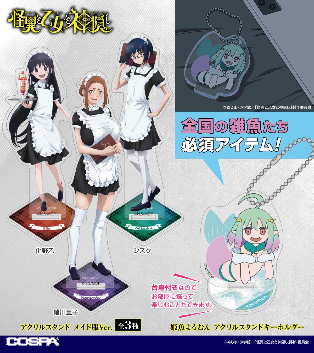 TVアニメ「怪異と乙女と神隠し」メイド服姿の「菫子」「乙」「シズク」のアクリルスタンドをはじめ、「怪異出現注意」Tシャツや「姫魚よるむん」のグッズなどが登場!【株式会社コスパ】