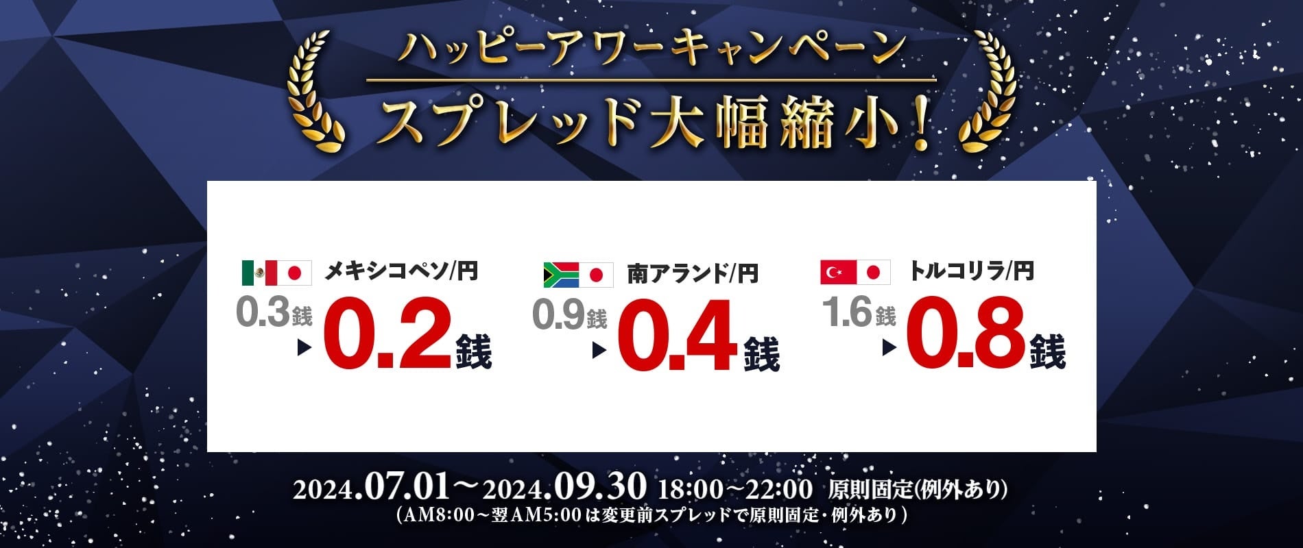 FX口座におけるメキシコペソ/円、南アフリカランド/円、トルコリラ/円の高金利3通貨ペアのスプレッドを、月曜日から金曜日の18:00~22:00の時間限定で大幅縮小いたします。