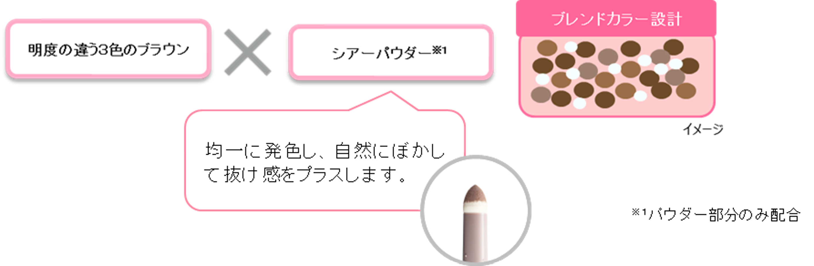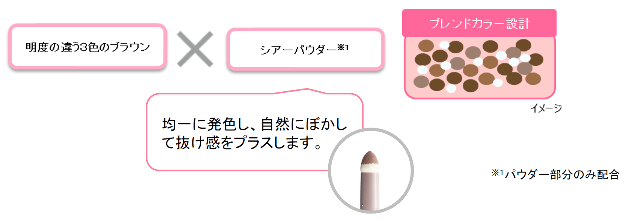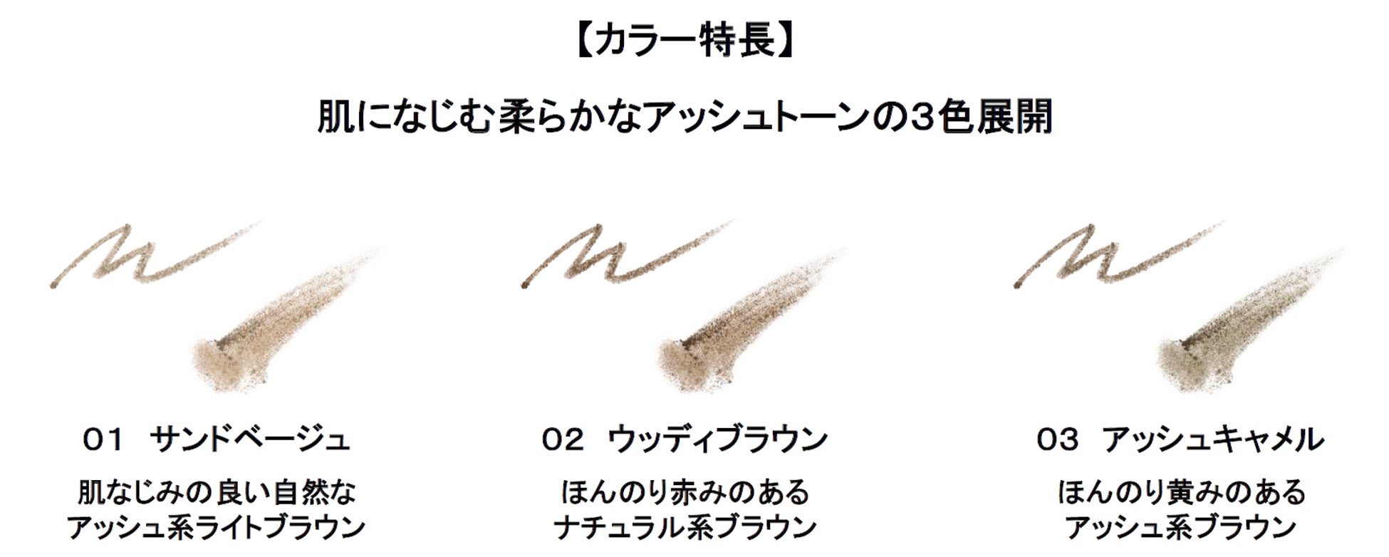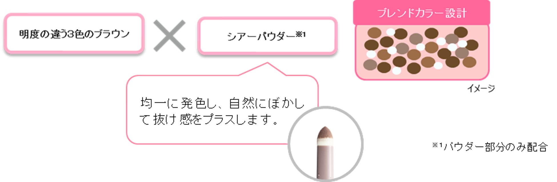 ◇3色のブラウンとシアーパウダー※1をミックスしたブレンドカラー設計で、のっぺりとした単調な眉にならず、ワンストロークで深みのある美発色を叶えます。