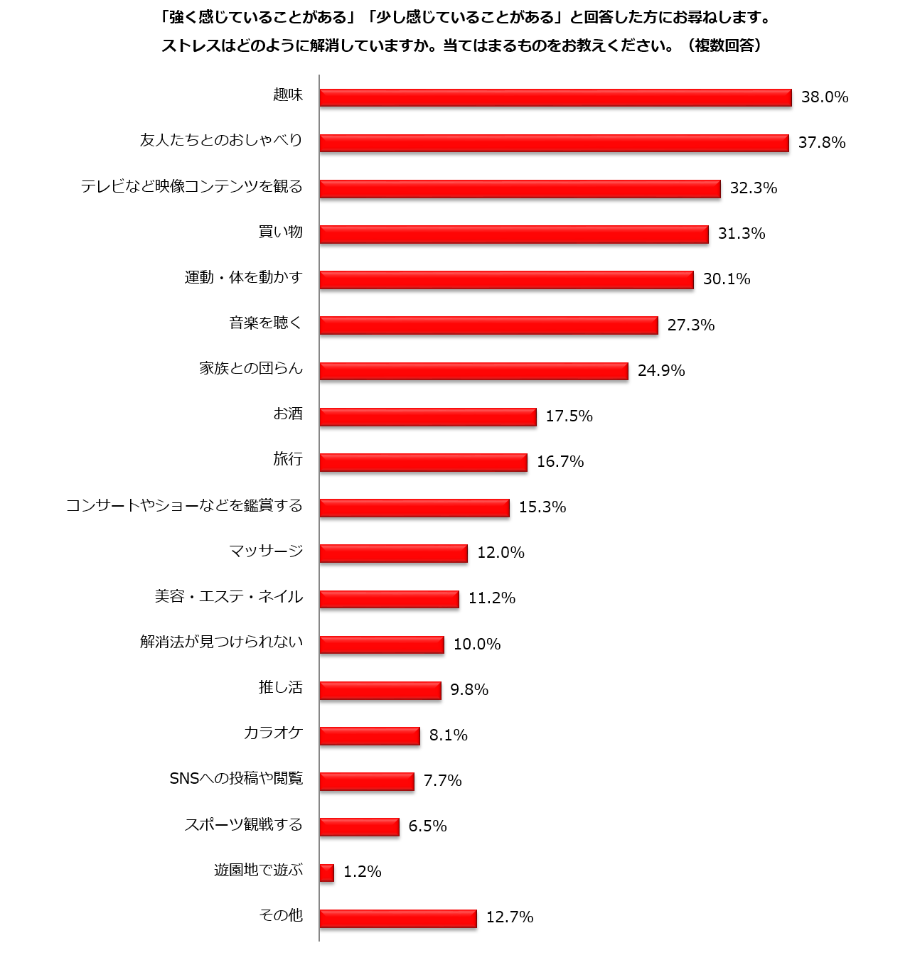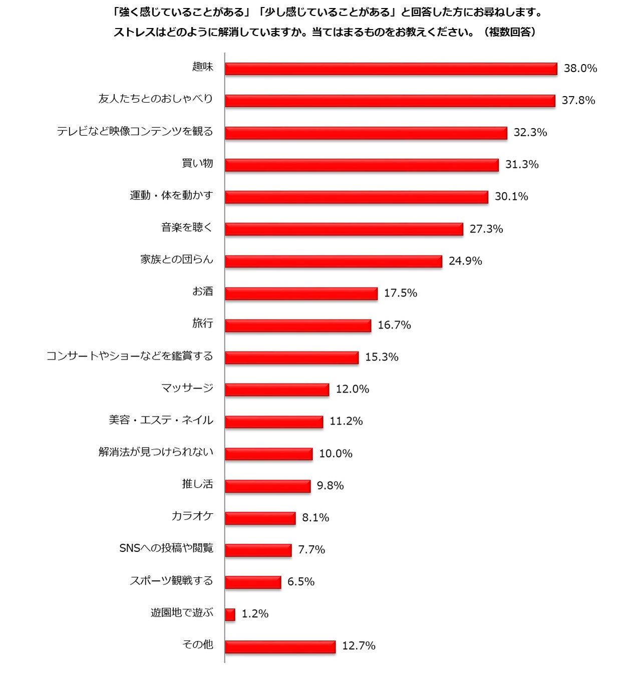 一方、ストレスを感じていることが「ある」と回答した人にストレス解消法を尋ねると最も多かったのは「趣味」で38.0%。続けて「友人たちとのおしゃべり」37.8%、「テレビなど映像コンテンツを観る」32.3%となりました。フリーコメントにも様々なストレス解消法が寄せられました。コロナ禍で長く外出自粛やマスク着用が求められる生活が続きましたが、少しずつコロナ禍前の日常が戻りつつある中でストレスとの向き合い方も新しいフェーズに入ろうとしています。GWなど家族全員で家にいる機会が多くなる世の中のお休みが、主婦層にとっては繁忙期になっている場合もあります。日々の生活の中で大半の主婦・主夫層がストレスを感じている中、自分に合ったストレス解消法を見つけることがより豊かな日常生活を実現する上で大切な要素になっているのだと思います。