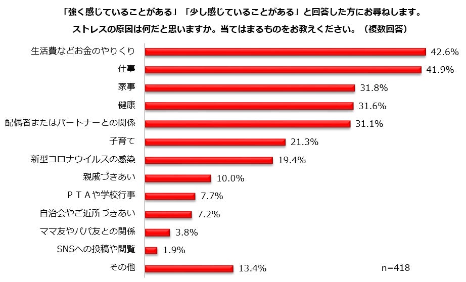 生活していると、様々なストレスを感じることがあります。仕事と家庭の両立を希望する主婦・主夫層に「いま、日々の生活の中でストレスを感じていることはありますか」と尋ねたところ、「ある」と回答した人が9割近くに及びました。その結果をお子さんがいるかいないかで比較すると、お子さんがいる人の方が、ストレスを「強く感じていることがある」と回答した人の比率が13.3ポイント高くなりました。お子さんがいる人の方が日々の生活における負担感が強いということかもしれません。またストレスを感じていることが「ある」と回答した人にその原因を尋ねると、最も多かったのが「生活費などお金のやりくり」で42.6%。さらに「仕事」41.9%、「家事」31.8%と続きました。なお、「その他」に寄せられた声としては介護やPTA、人間関係などがありました。