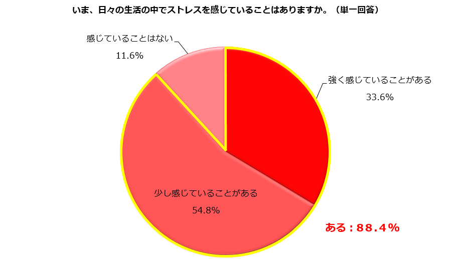 1.日々の生活の中でストレスを感じていることが「ある」88.4% 2.ストレスを感じていることあるか:子どもいる・いない別比較 3.ストレスの原因:1位「生活費などお金のやりくり」42.6% 4.ストレス解消法:1位「趣味」38.0% 5.ストレスの原因・ストレス解消法ランキング TOP5 6.フリーコメントより |