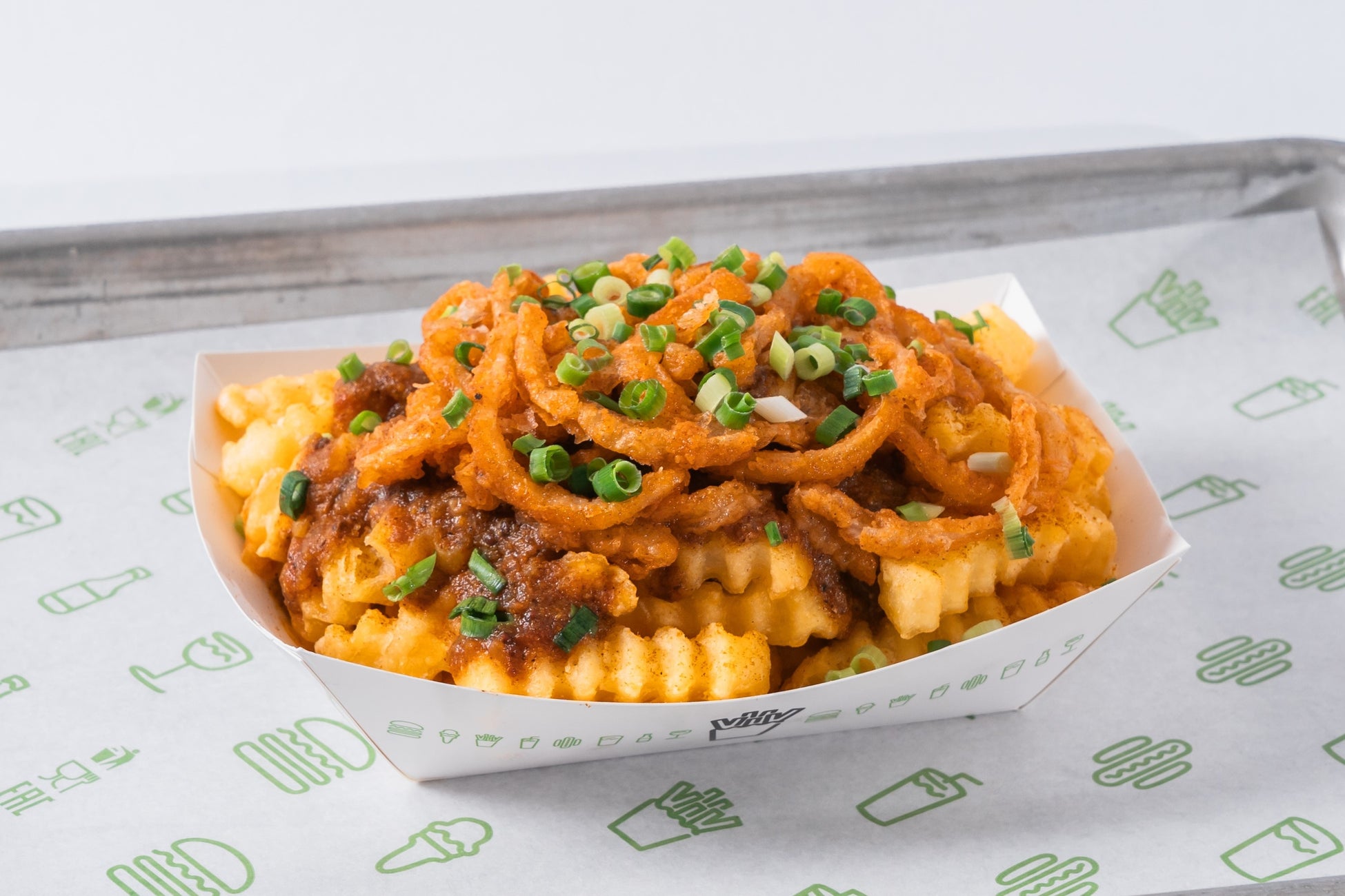 商品概要︓シェイク シャックで安定した⼈気を誇る、外はカリっと、中はホクホクのシンプルなクリンクルカットフライに、スパイスの⾹るカレーソース、⾹ばしいフライドオニオン、ネギをトッピング。