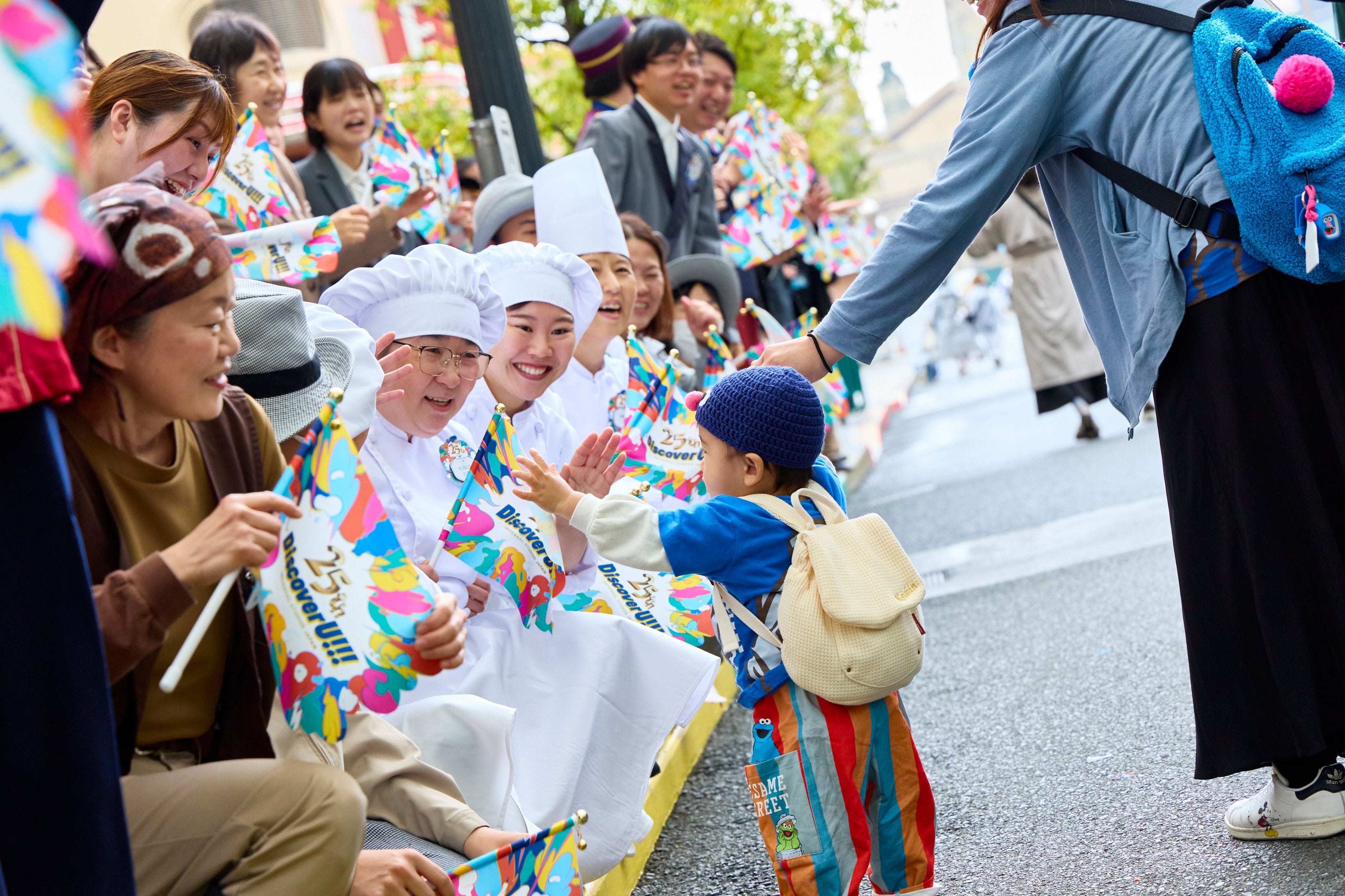ゲートオープン後には、クルー(従業員)が25周年のパレードフラッグを手にゲストをお迎えする「アニバーサリー・グリーティング」も実施。周年当日のグリーティングとして過去最多となる約650人のクルーが集結し、皆それぞれに25年分の感謝の想いを伝えながら、ゲストとともにパークの“お誕生日”をお祝いし、笑顔で喜びを分かち合いました。