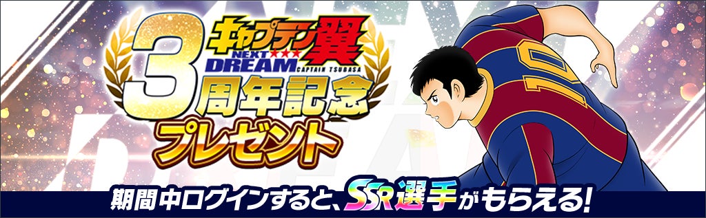 KLab株式会社(本社:東京都港区、代表取締役社長 森田英克、以下「KLab」)が提供するスマートフォン向け対戦型サッカーシミュレーションゲーム『キャプテン翼 ~たたかえドリームチーム~』では、高橋陽一先生原案の新ストーリー『NEXT DREAM』の配信3周年を記念した豪華キャンペーンを開催いたします。