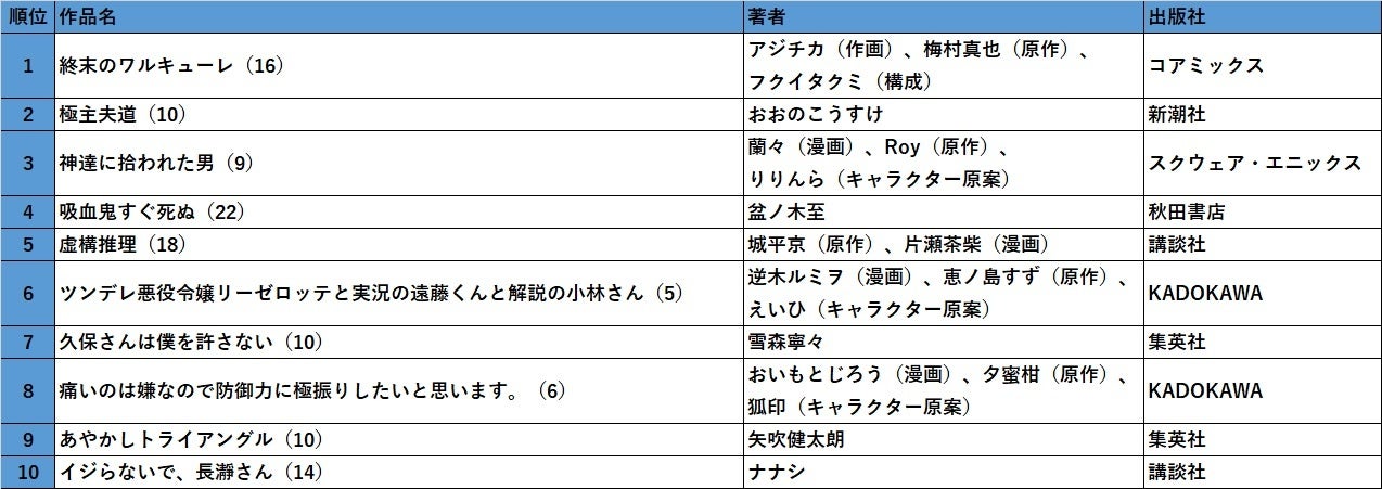 【2023年1月開始冬アニメ 原作本ランキングを発表 】第1位は「神」vs「人類」のタイマンを迫力満点に描く『終末のワルキューレ』!ランキングから注目の作品をチェック!