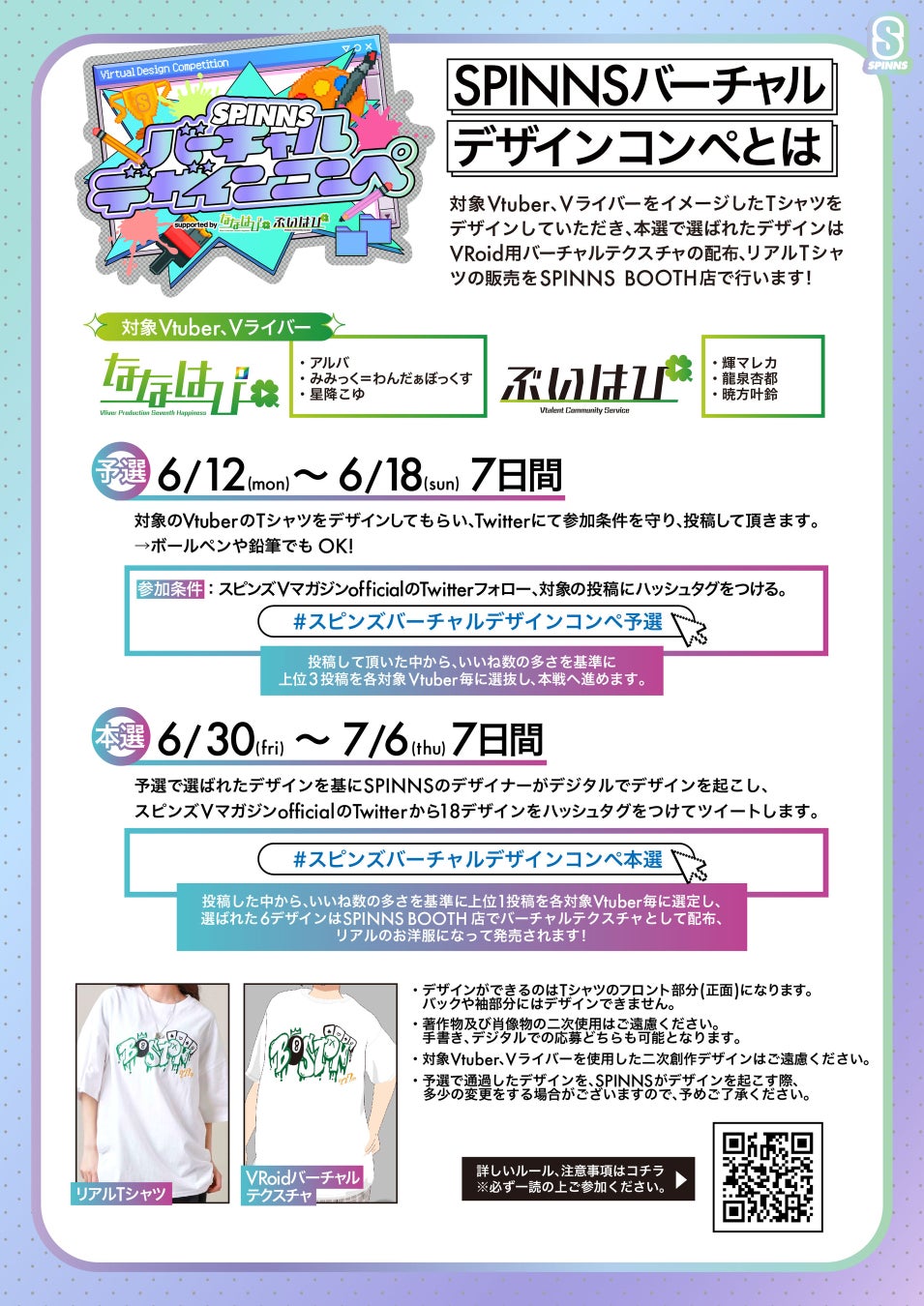 アパレル事業を展開する株式会社ヒューマンフォーラム(本社:京都市中京区 代表取締役会長:出路 雅明)が運営するアパレルブランド「SPINNS」が主催してバーチャルタレントプロダクション「ななはぴ」、個人勢Vtuber・Vliverをサポートするコミュニティサービス「ぶいはぴ」にご協力いただき、TwittetでのTシャツデザインコンペ開催決定し、現在予選が始まっている。