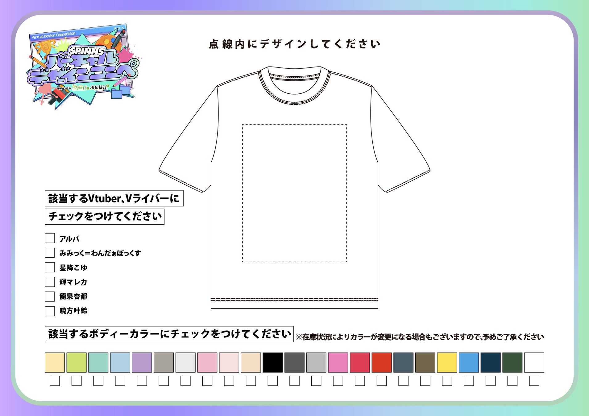 対象のVtuber、VライバーのTシャツをデザインし、本選で選ばれた6デザインはVRoid用バーチャルテクスチャの配布、リアルTシャツの販売をSPINNS BOOTH店で行います。