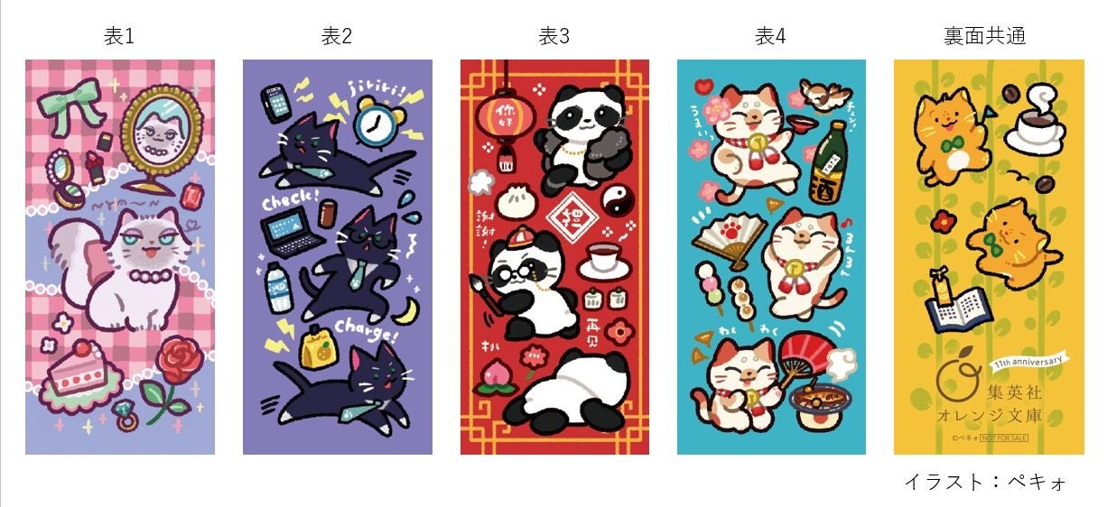 また、フェア実施中の書店では、フェア対象本を購入いただいた方に、限定しおりを4種の中から1枚プレゼント! イラストレーター・ペキォ氏が本フェアのために描き下ろした、オレンジ文庫公式キャラクター・ぶんたんとその仲間たちのイラストです。