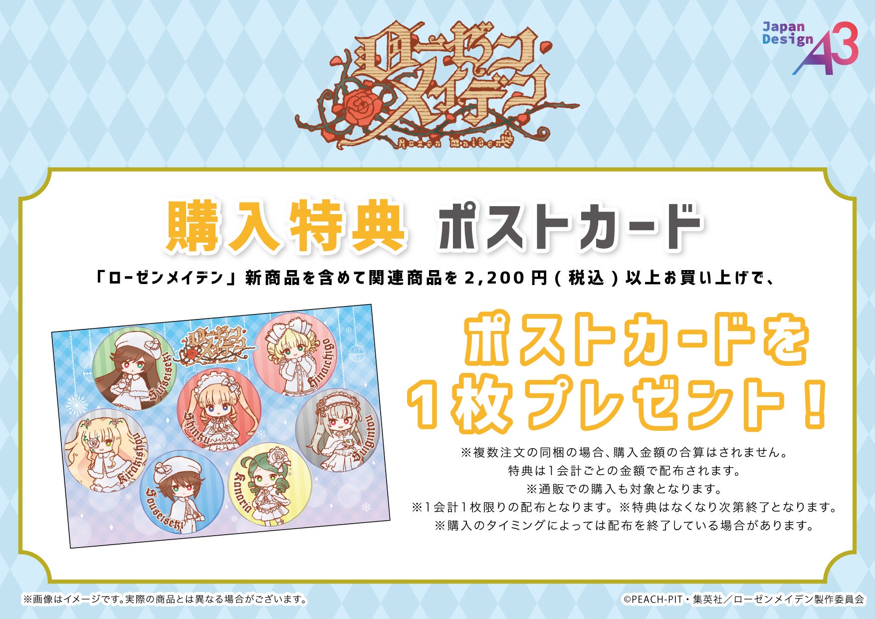 TVアニメ『ローゼンメイデン』の新作グッズを含む関連商品を1会計2,200円(税込)以上お買い上げで、ポストカードを1枚プレゼントします。