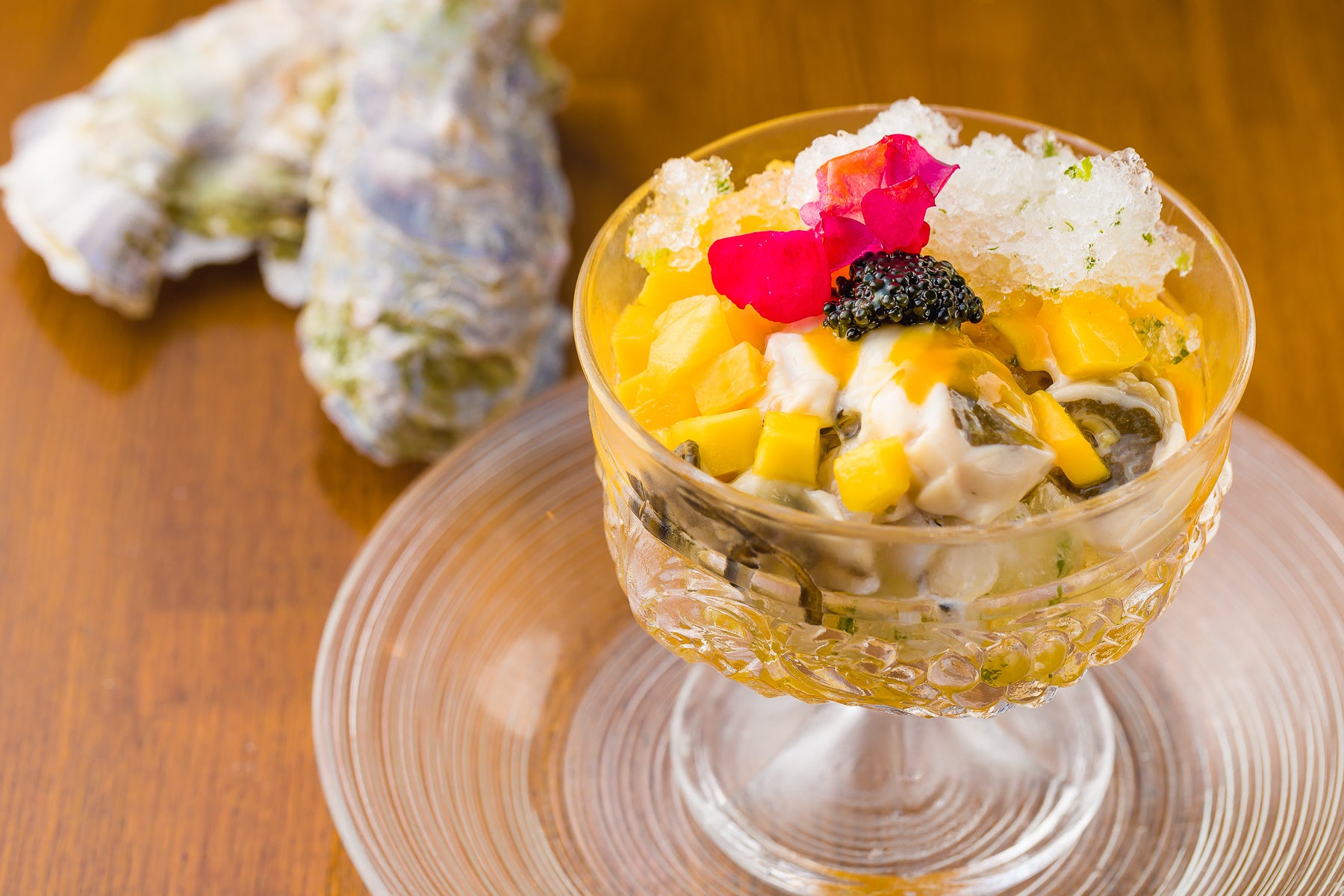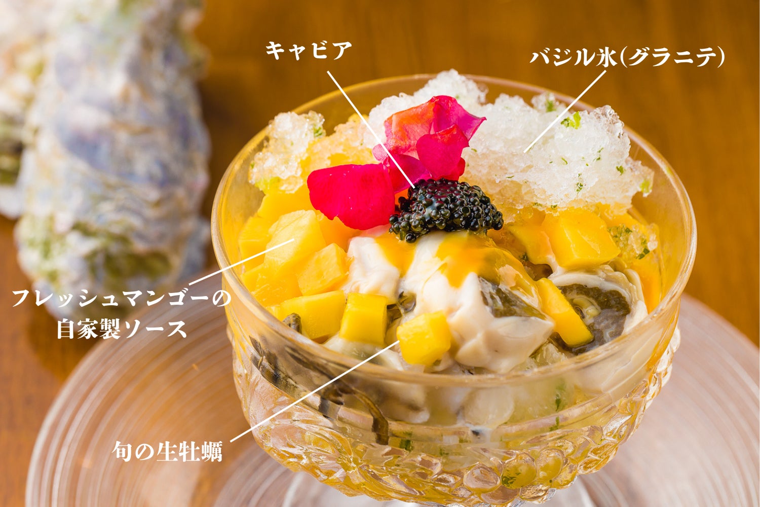 使用するソースは、なんとマンゴーのフレッシュソース。濃厚なマンゴーは牡蠣のクリーミーさと融合し、その旨味を存分に際立たせてくれます。氷の部分は、フランス料理で用いられるシャリシャリした食感の氷菓子「グラニテ」を応用しました。バジルを一緒に凍らせているため、牡蠣やソースと合わせて食べると、最後に爽快さが残り何口でも食べたくなる味わいです。