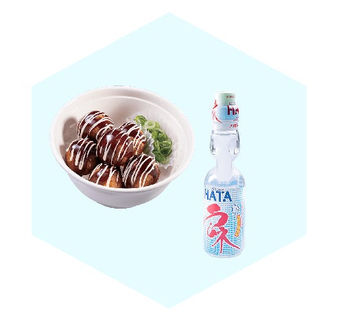 (特盛 揚げたこ焼き~マヨ・青ねぎ~+なつかしビー玉ラムネ)