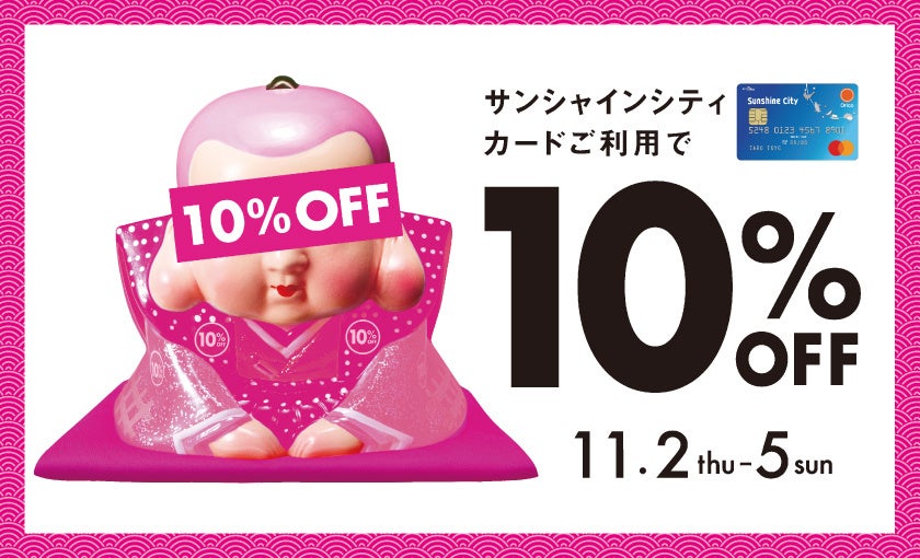 専門店街アルパの対象店舗にてサンシャインシティカードをご利用いただくと、引き落とし時に会計金額から10%OFFになる「サンシャインシティカード10%OFF」を実施します。お買い物当日の19時までにお申し込みしていただきますと、即日発行可能です。