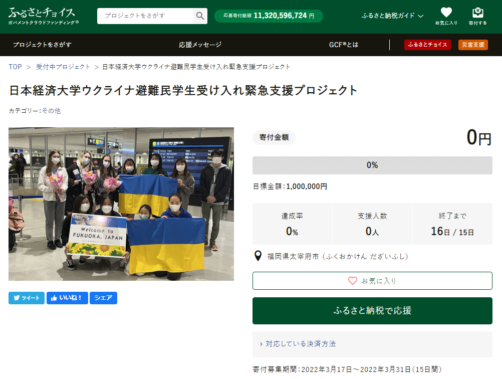 本日から福岡県太宰府市が募集を始め、随時全国の自治体でも寄付募集を開始する予定です。ふるさとチョイスでは、ウクライナからの避難民受け入れを目的とした寄付募集において自治体から寄付受付のためのサイト利用手数料はいただきません。